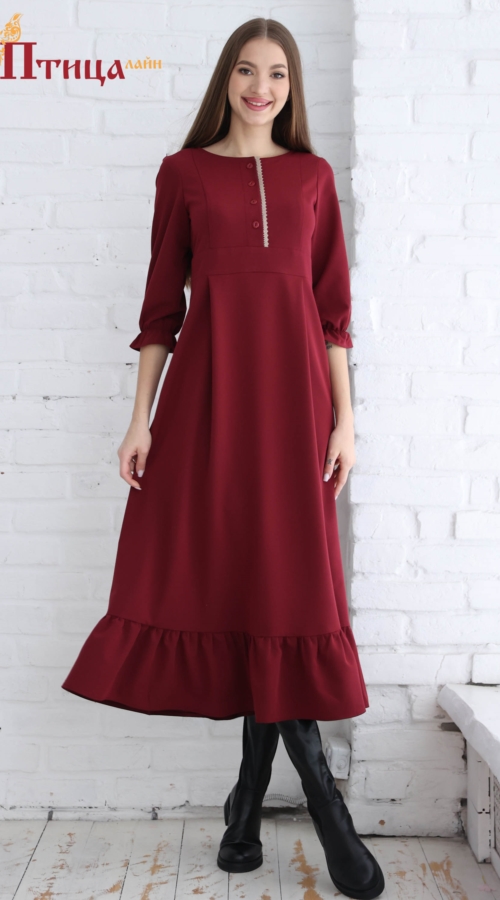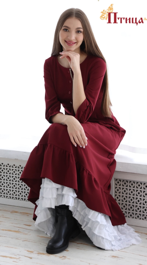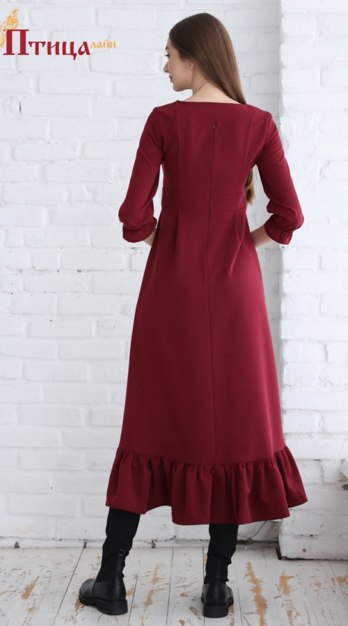 Платье женское выполненное из шикарного штапеля отрезное с втачным поясом, линия талии завышенная. Юбка расклешенная к низу, с двумя складками, по низу юбки богатая рюша. Рукав втачной, широкий, длиной 3/4, ни...