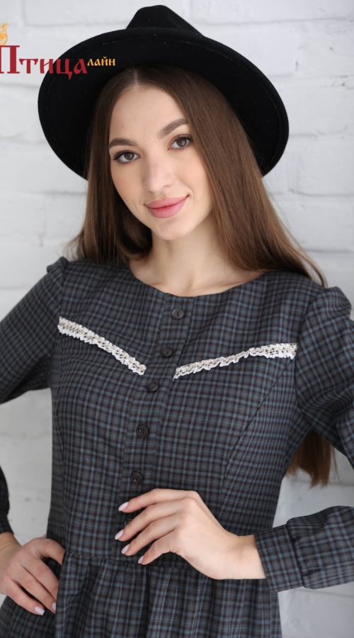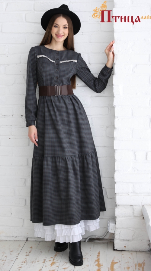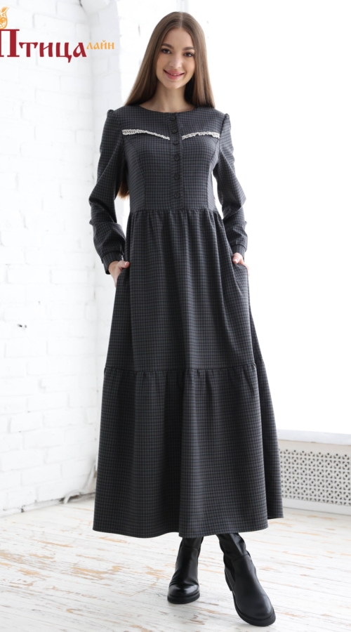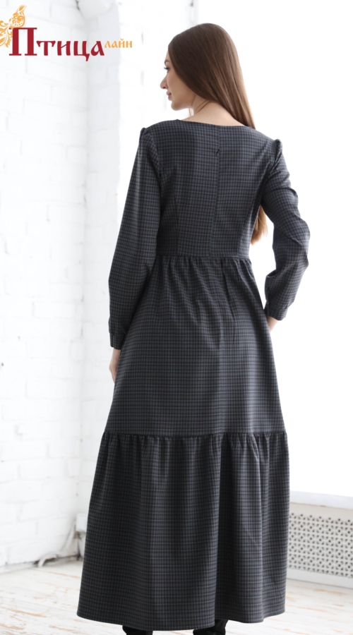 Платье женское отрезное по талии, полуприлегающего силуэта. Юбка расширенная к низу с легкой сборкой по талии, в два яруса на сборку. Рукав втачной, расширенный к низу на широкой манжете. Для удобства по средне...