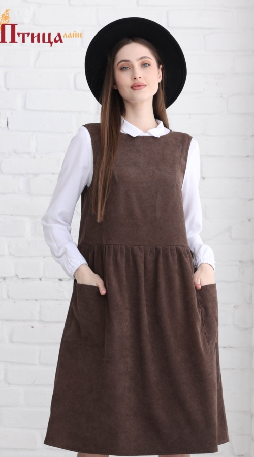 Сарафан свободного кроя, ниже линии колена, с надстрочными карманами. Юбка широкая, прямая. Равномерная сборка по линии талии украшает данный лаконичный образ. Идеальную посадку дарит нагрудная выточка, выхо...