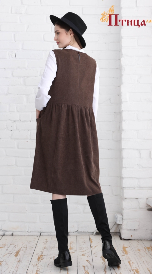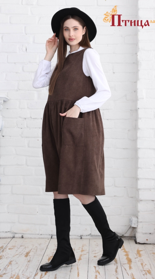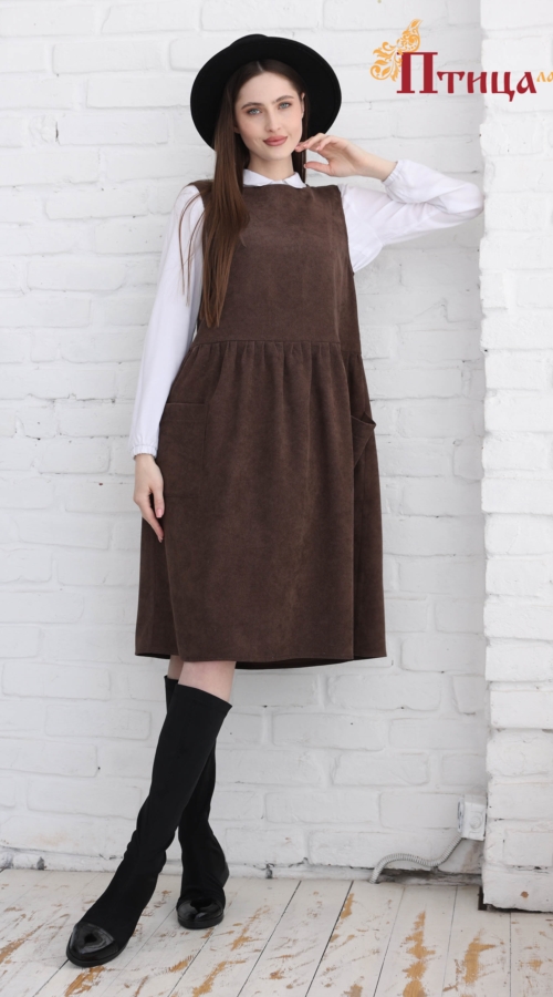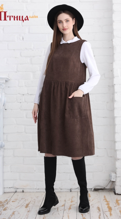Сарафан свободного кроя, ниже линии колена, с надстрочными карманами. Юбка широкая, прямая. Равномерная сборка по линии талии украшает данный лаконичный образ. Идеальную посадку дарит нагрудная выточка, выхо...