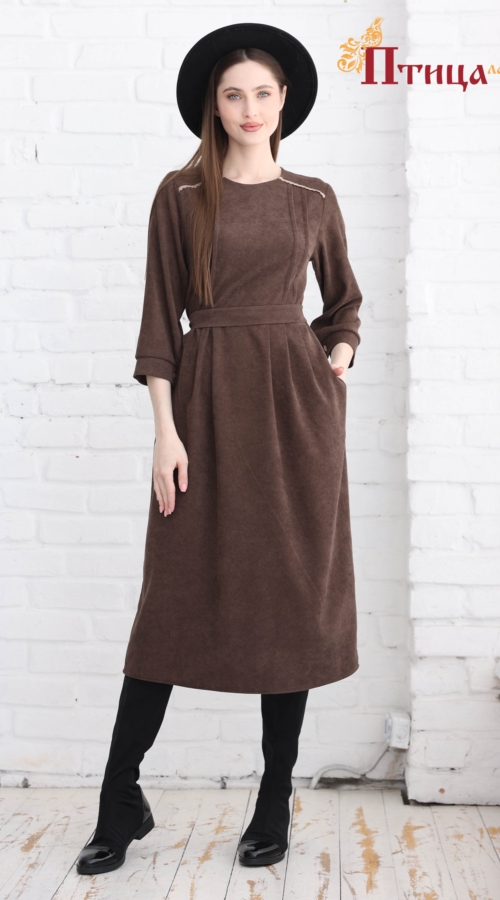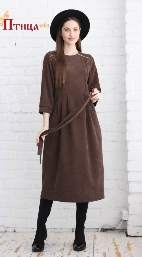 Эффектная модель платья с поясом с чуть завышенной линией талии. Юбка прямая с 6 складками по передней и задней части юбки, юбка имеет хороший шаг. Модель прямого силуэта. Рукав втачной, прямой с глубокой пройм...