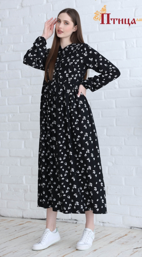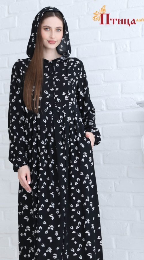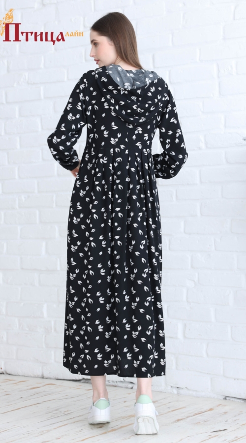 Платье женское с капюшоном отрезное по талии, линия талии завышенная. Юбка широкая с со складками по центу изделия, по передней и задней части юбки, что создает дополнительную свободу в области талии и бедер. Р...