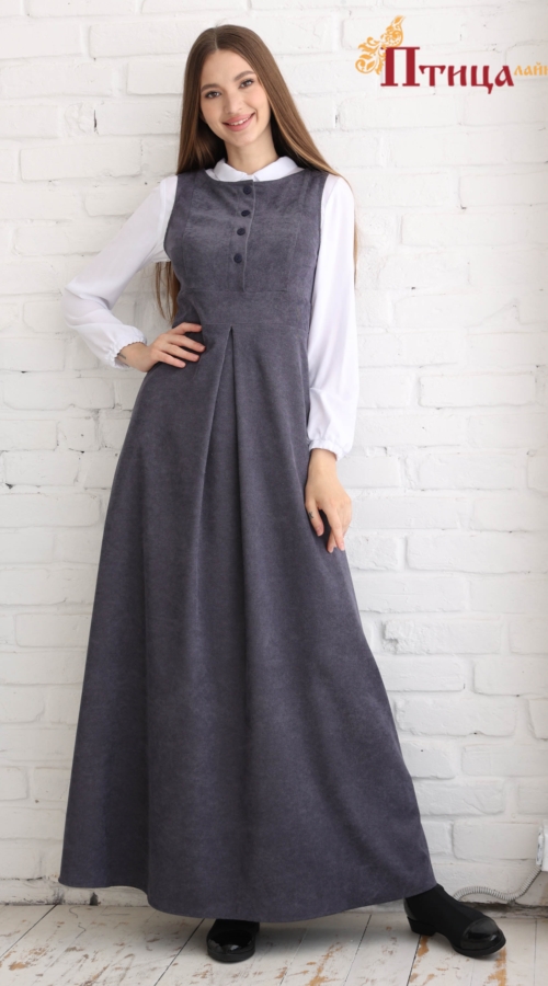 Сарафан «Офисный» отрезной по талии, линия талии завышенная. Юбка расклешенная к низу, по полочке встречная складка. Рельефы на полочке и спинке. Для удобства по среднему шву на спинке застежка на «молнию». По ...