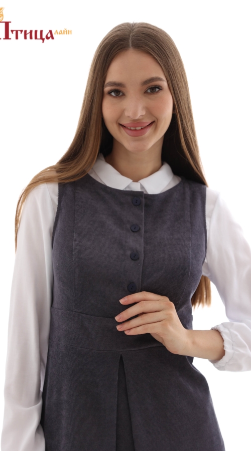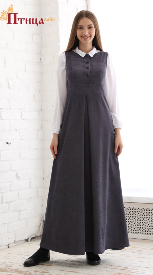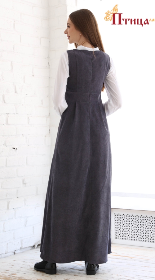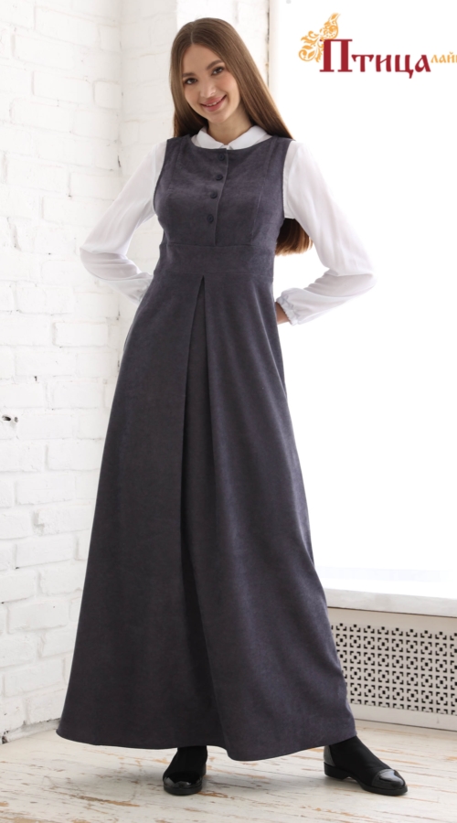 Сарафан «Офисный» отрезной по талии, линия талии завышенная. Юбка расклешенная к низу, по полочке встречная складка. Рельефы на полочке и спинке. Для удобства по среднему шву на спинке застежка на «молнию». По ...