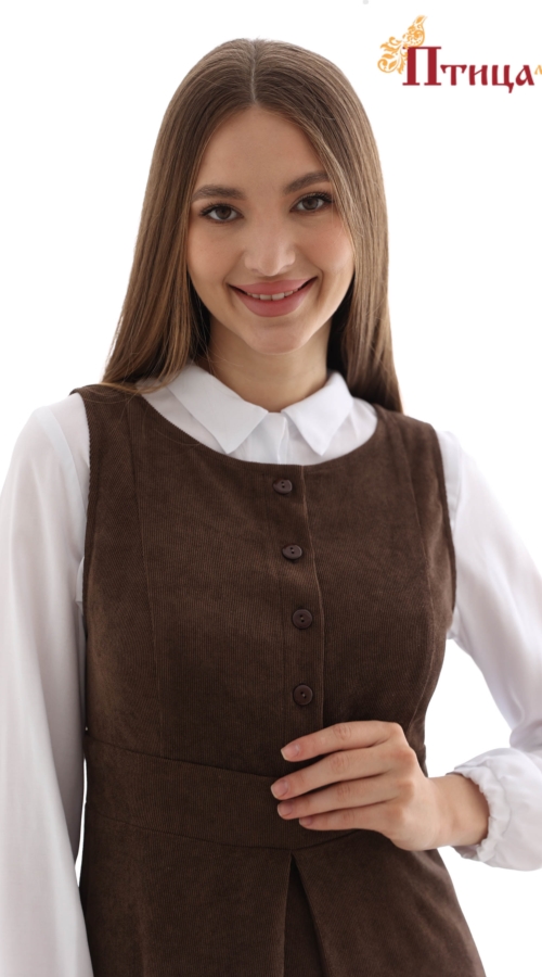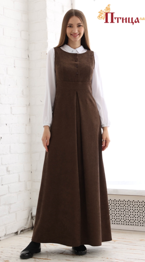 Сарафан отрезной по талии, линия талии завышенная. Юбка расклешенная к низу, по полочке встречная складка. Рельефы на полочке и спинке. Для удобства по среднему шву на спинке застежка на «молнию». По линии тали...