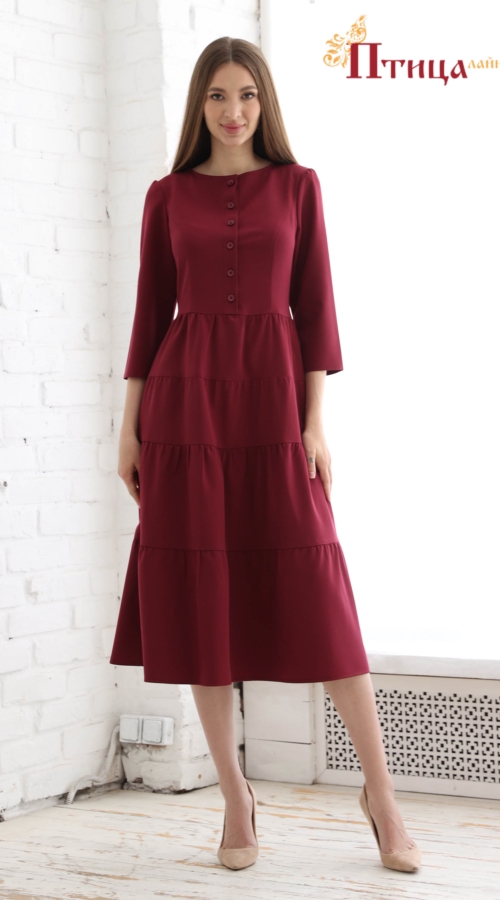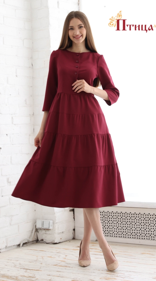 Платье отрезное по линии талии, полуприлегающего силуэта. Юбка расширенная к низу с легкой сборкой по талии, в четыре яруса на сборку. Рукав широкий втачной укороченный, длиной 3/4. Для удобства по среднему ...