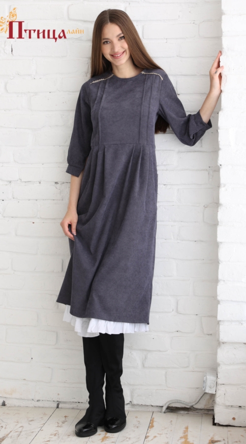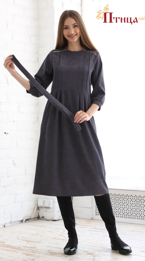 Эффектная модель платья с поясом с чуть завышенной линией талии. Юбка прямая с 6 складками по передней и задней части юбки, юбка имеет хороший шаг. Модель прямого силуэта, застежка по спинке на молнию. Рукав вт...