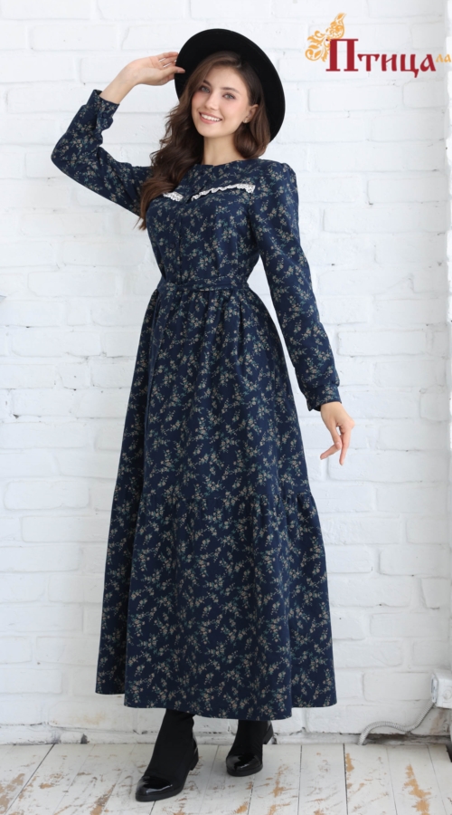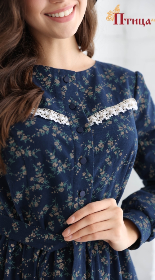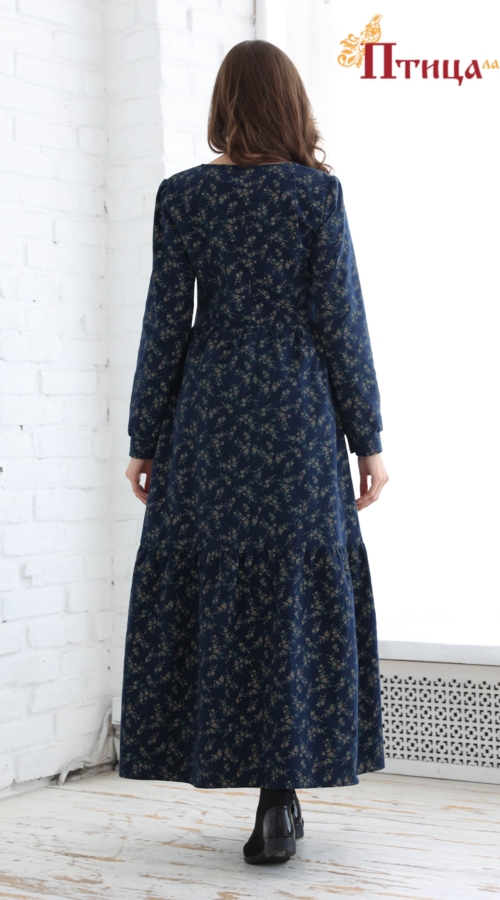 Платье женское отрезное по талии, полуприлегающего силуэта. Юбка расширенная к низу с легкой сборкой по талии, в два яруса на сборку. Рукав втачной, расширенный к низу на широкой манжете. Для удобства по средне...