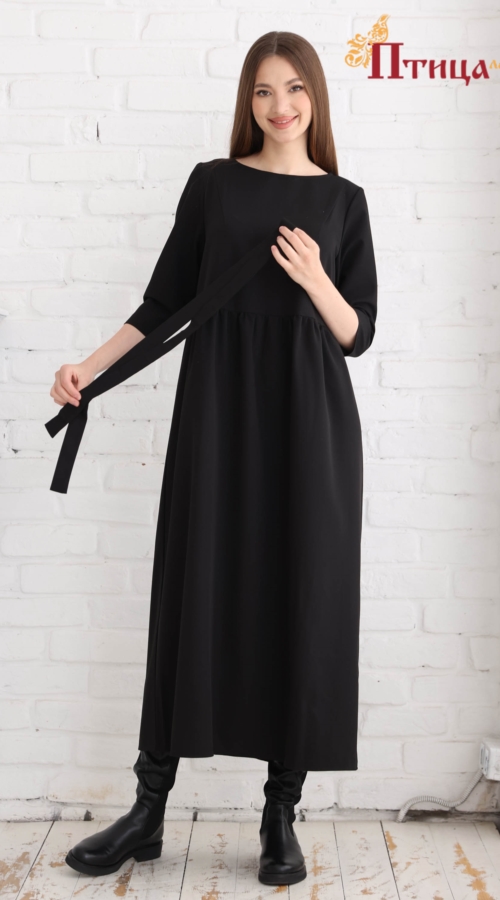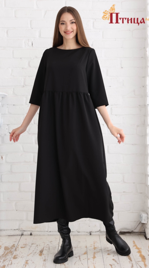 Платье женское отрезное с завышенной линией талии. Юбка широкая, прямая. Равномерная сборка по линии талии украшает данный лаконичный образ. Рукав втачной с углубленной проймой, что добавлет ширину рукава. И...