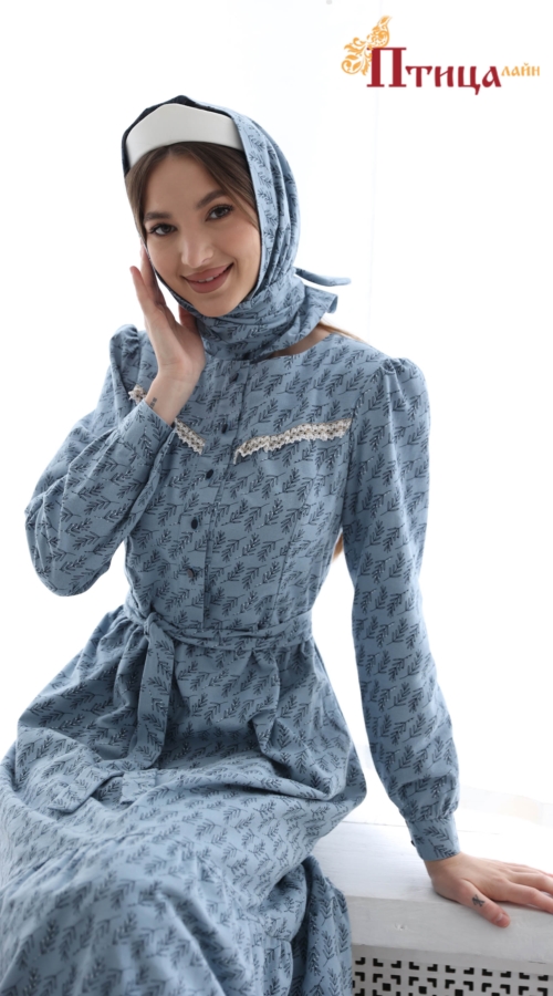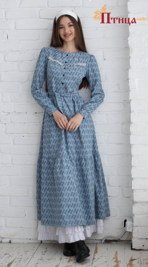 Платье женское отрезное по талии, полуприлегающего силуэта. Юбка расширенная к низу с легкой сборкой по талии, в два яруса на сборку. Рукав втачной, расширенный к низу на широкой манжете. Для удобства по среднему шву на спинке застежка на «молнию».
