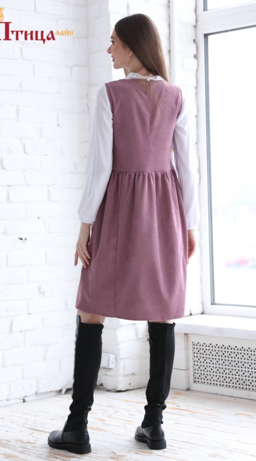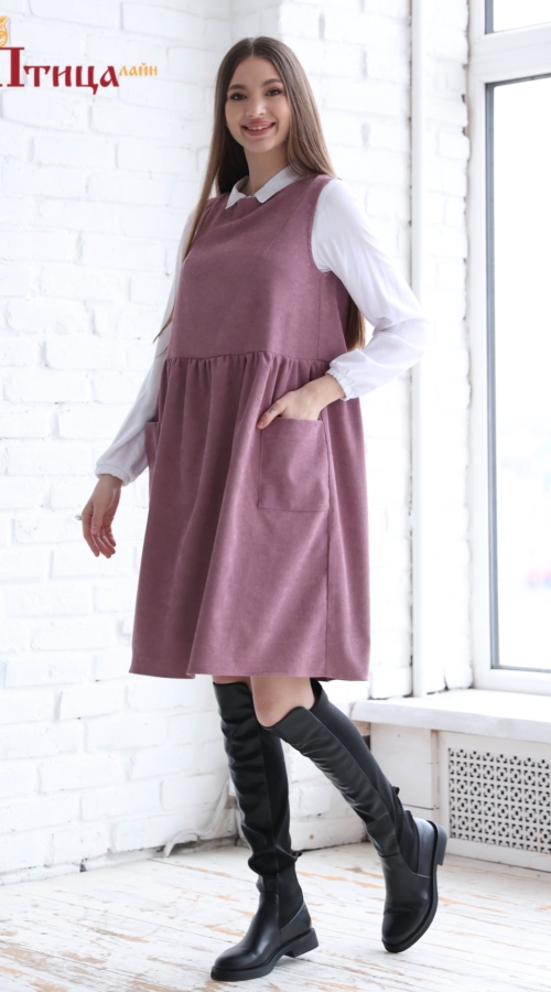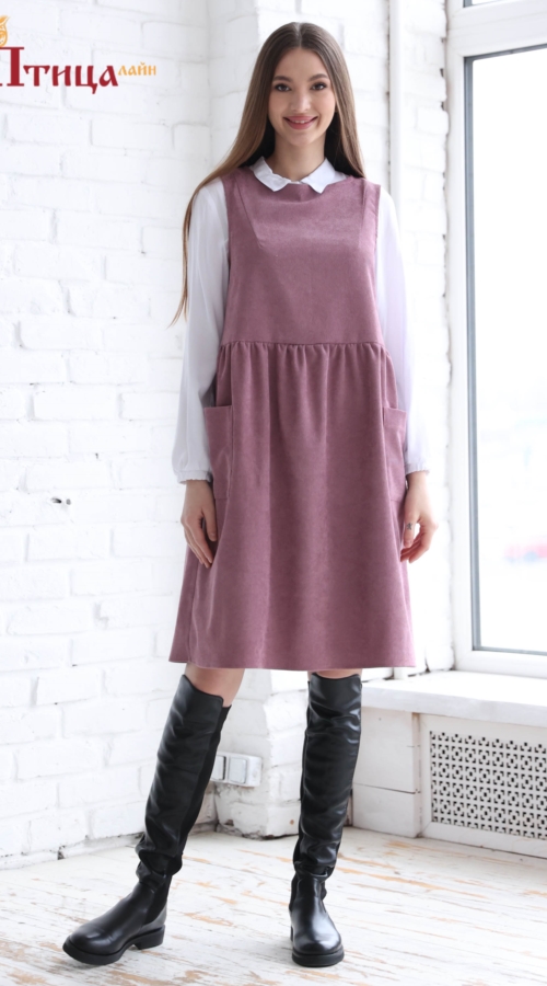 Сарафан свободного кроя, ниже линии колена с надстрочными карманами. Юбка широкая, прямая. Равномерная сборка по линии талии украшает данный лаконичный образ. Идеальную посадку дарит нагрудная выточка, выходящ...