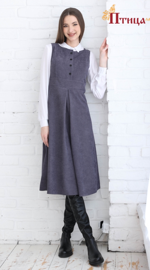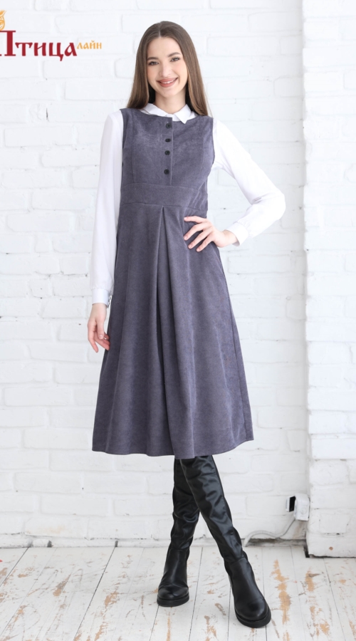 Сарафан отрезной по талии, линия талии завышенная. Юбка расклешенная к низу, по полочке встречная складка. Рельефы на полочке и спинке. Для удобства по среднему шву на спинке застежка на «молнию». По линии тали...