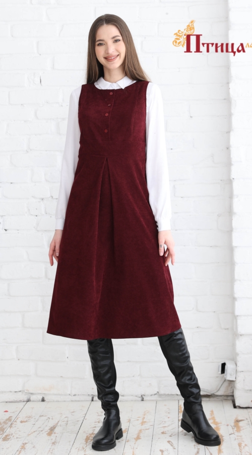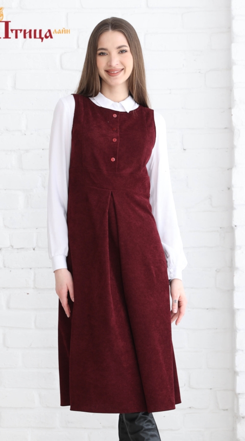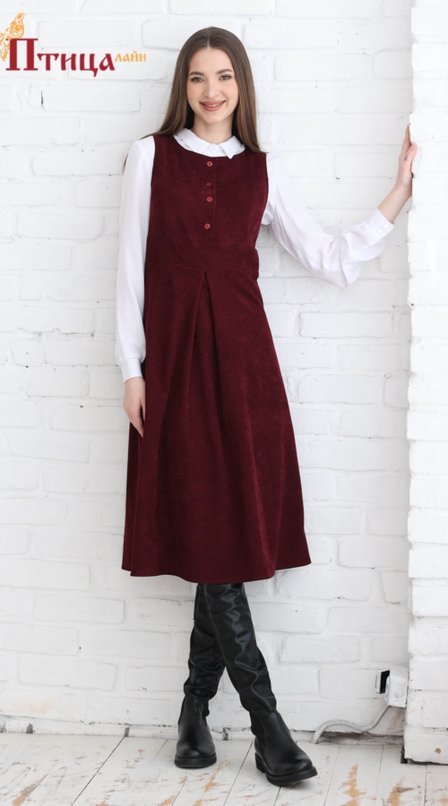Сарафан отрезной по талии, линия талии завышенная. Юбка расклешенная к низу, по полочке встречная складка. Рельефы на полочке и спинке. Для удобства по среднему шву на спинке застежка на «молнию». По линии тали...