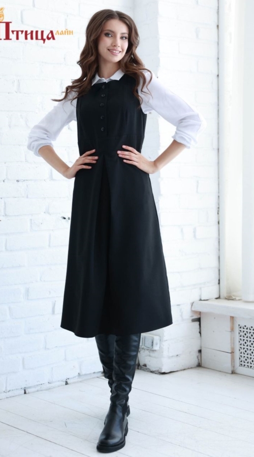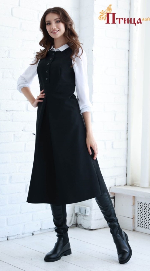 Сарафан отрезной по талии, линия талии завышенная. Юбка расклешенная к низу, по полочке встречная складка. Рельефы на полочке и спинке. Для удобства по среднему шву на спинке застежка на «молнию». По линии тал...
