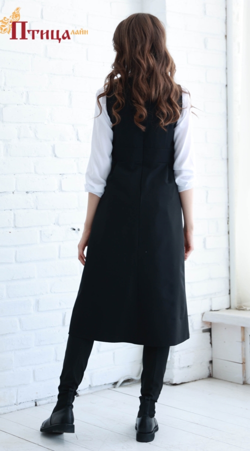 Сарафан отрезной по талии, линия талии завышенная. Юбка расклешенная к низу, по полочке встречная складка. Рельефы на полочке и спинке. Для удобства по среднему шву на спинке застежка на «молнию». По линии тал...