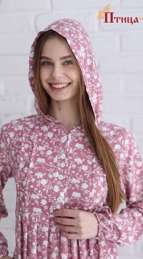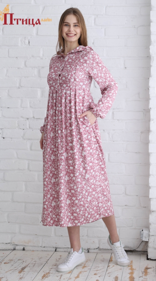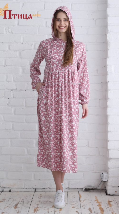Платье женское с капюшоном отрезное по талии, линия талии завышенная. Юбка широкая с со складками по центу изделия, по передней и задней части юбки, что создает дополнительную свободу в области талии и бедер. Р...
