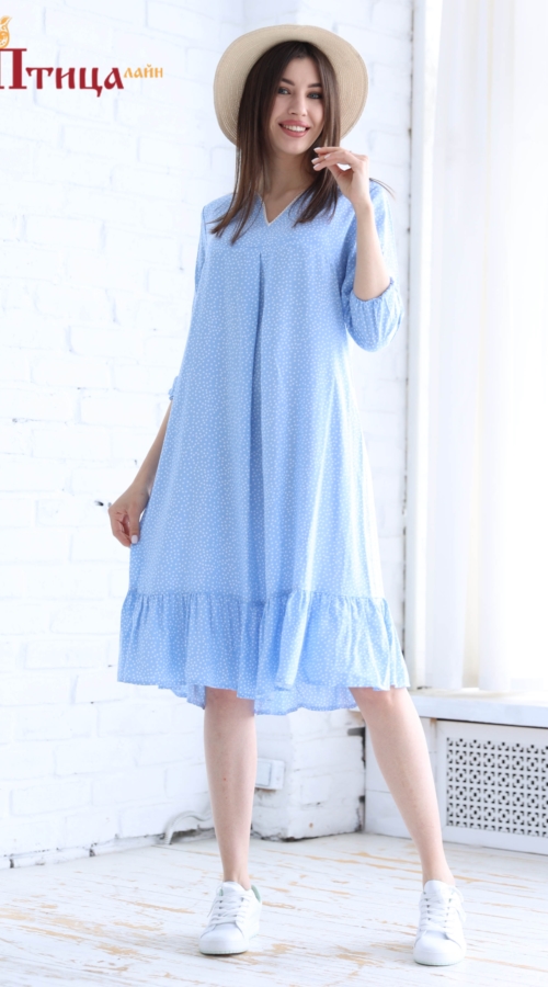 Платье трапециевидного силуэта, с углубленным вырезом, вырез украшен льняным кружевом. Рукав втачной на резинке длиной 3/4. Платье идеально в летний период, за счет рюши, по низу изделия, платья не прилегает к...