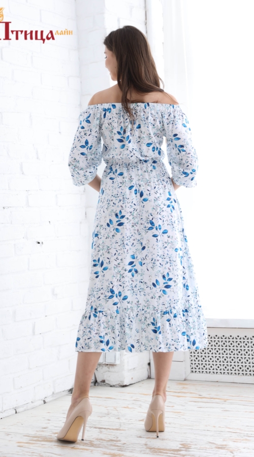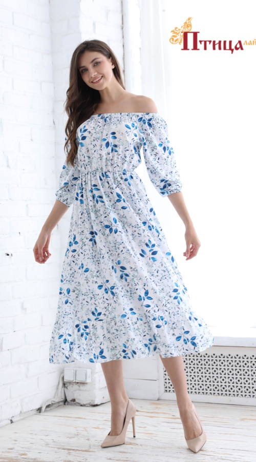 Необыкновенной красоты, платье с открытой линией плеча. Данный образ напоминает о море, солнце, летних теплых деньках, вечерних прогулках. Платье отрезное по талии, сборка на эластичную ленту по линии горловин...