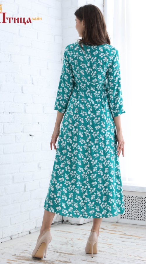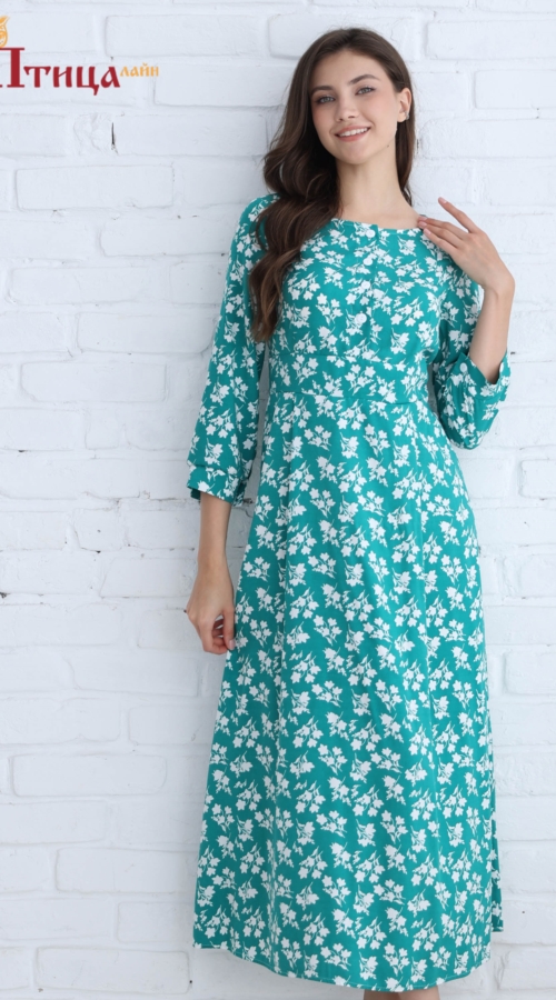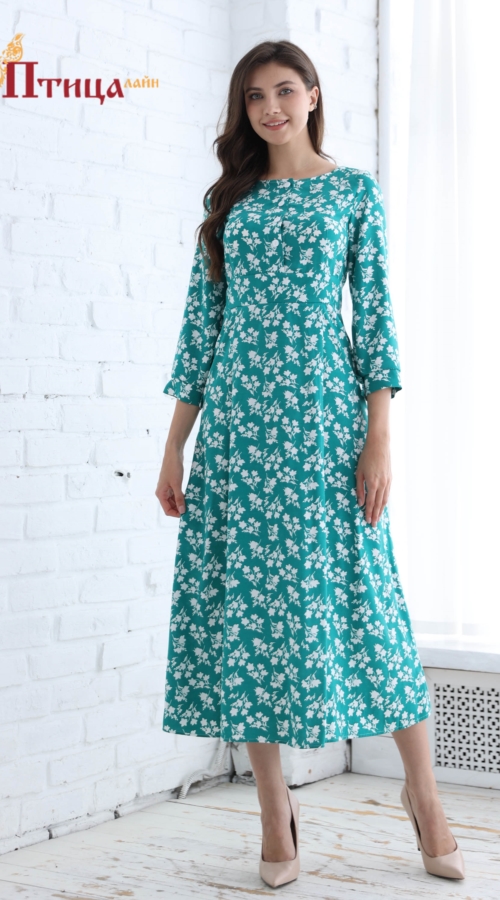 Платье женское отрезное с втачным поясом, линия талии завышенная. Юбка расклешенная к низу с карманами в боковом шве. Рукав втачной, широкий, длиной 3/4, низ рукава собран на мандету с пуговкой. Рельефы на пол...