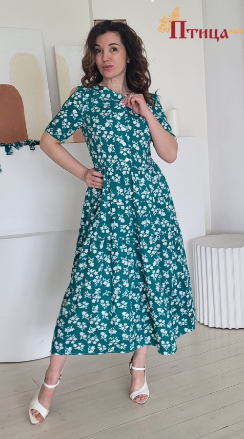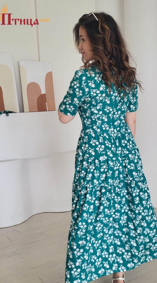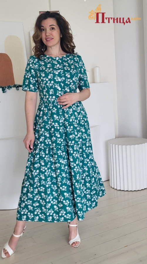 Платье женское отрезное по талии, полуприлегающего силуэта. Юбка расширенная к низу с легкой сборкой по талии, в четыре яруса на сборку. Рукав втачной укороченный. Для удобства по среднему шву на спинке застежк...
