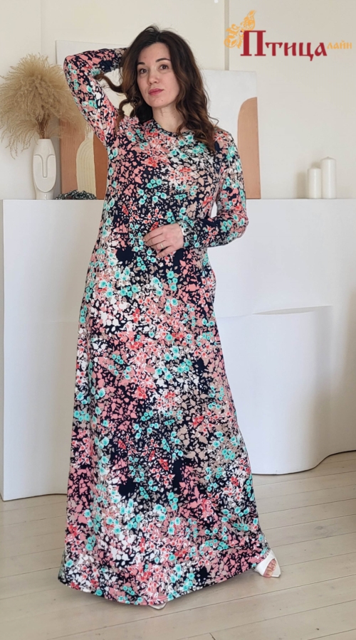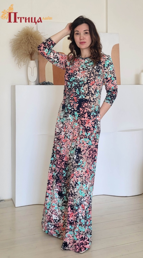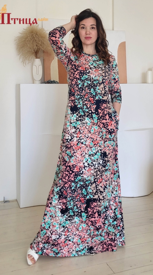 Платье прямого силуэта с карманами, чуть расклешенного к низу, длинный рукав.