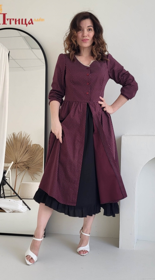 Платье отрезное по талии, полуприлегающего силуэта. Юбка расширенная к низу с легкой сборкой по талии. Линия горловины V-образный вырез с центральной застежкой, украшенный хлопковым кружевом. Рукав втачной длиной 3/4 , расширенный к низу на манжете. Рельефы по полочке и по спинке обеспечивают хорошую посадку изделию в любом размере.