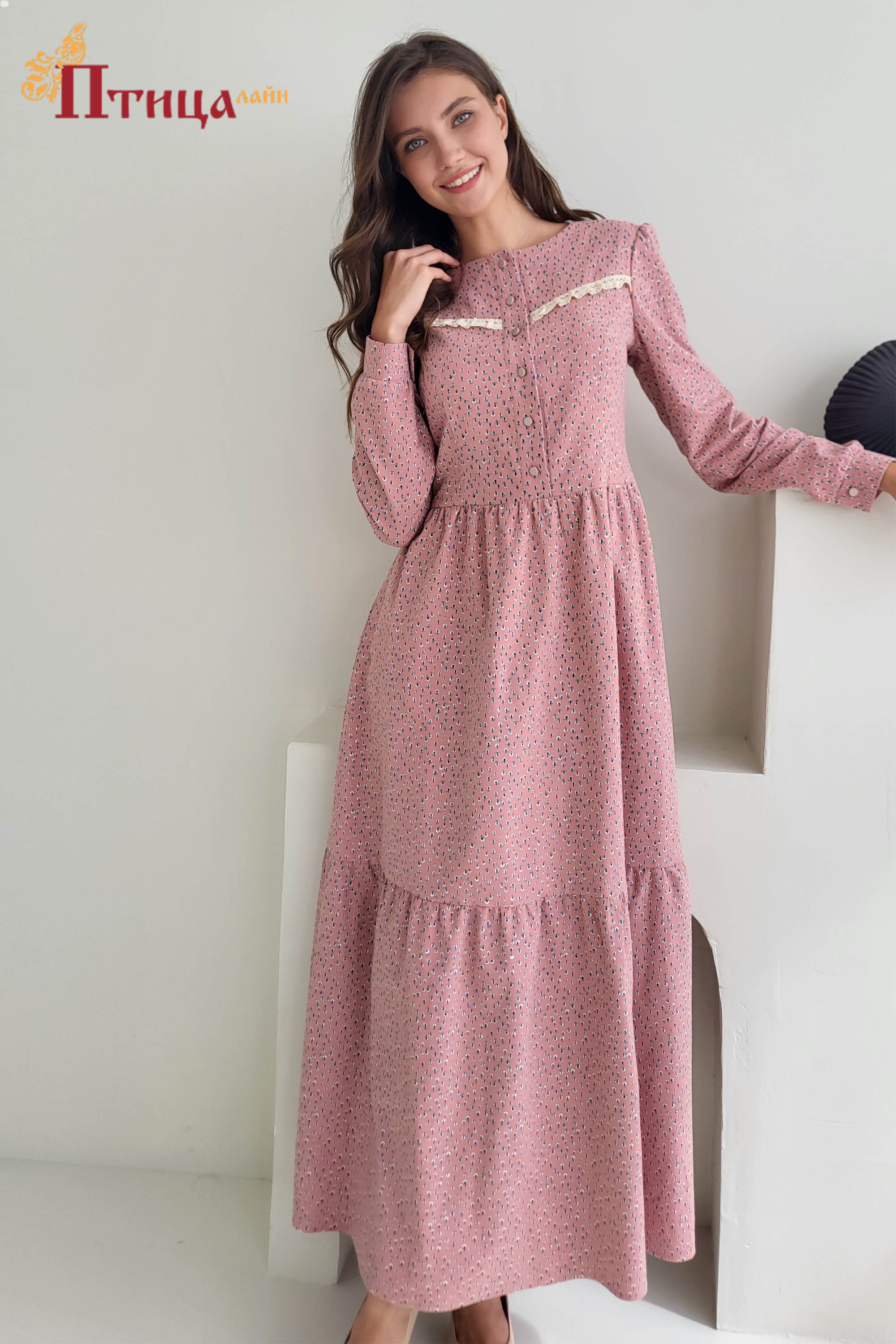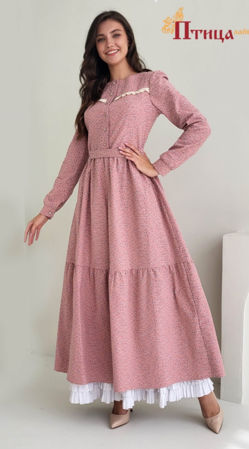 Платье женское отрезное по талии, полуприлегающего силуэта. Юбка расширенная к низу с легкой сборкой по талии, в два яруса на сборку. Рукав втачной, расширенный к низу на широкой манжете. Для удобства по средне...