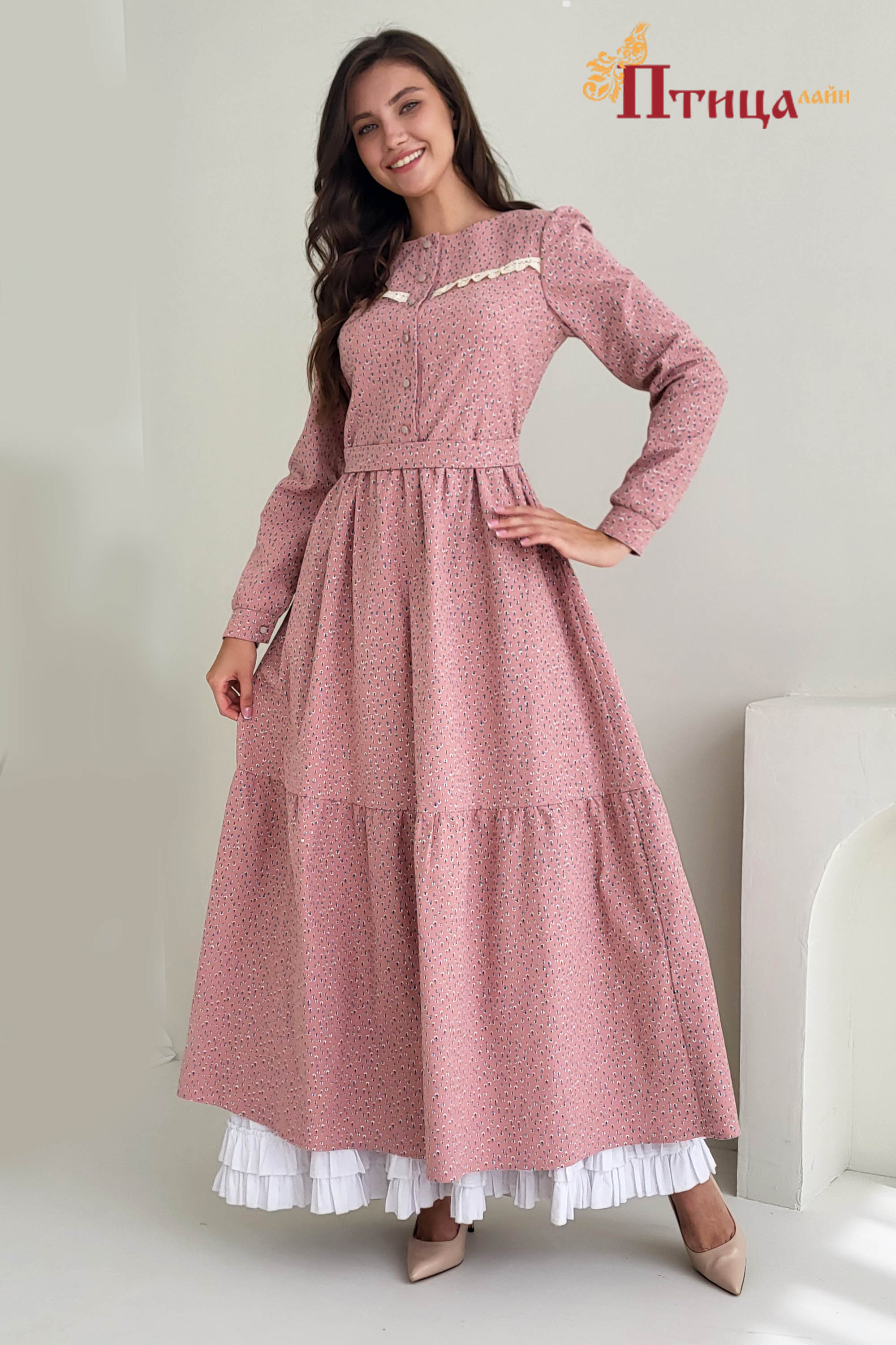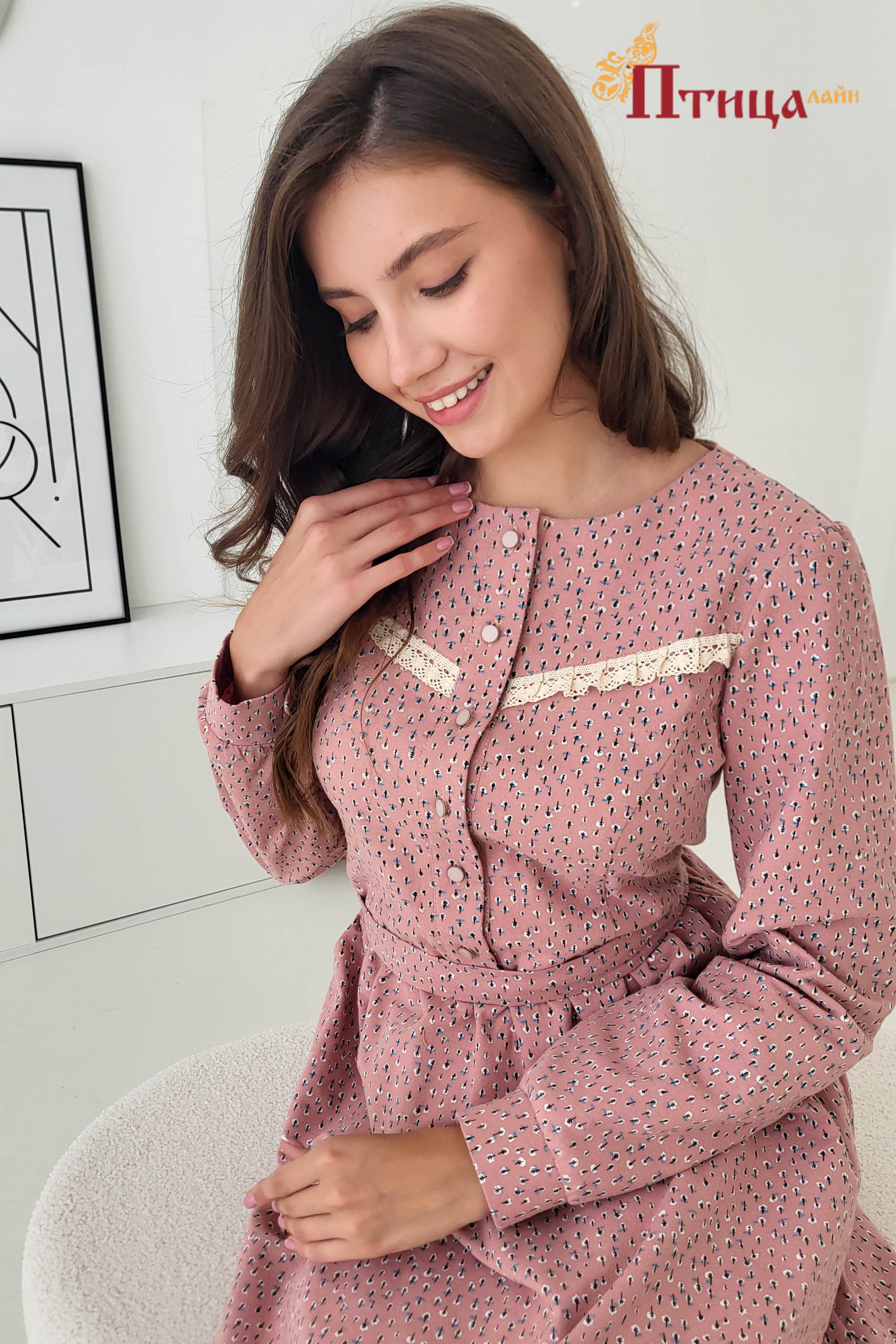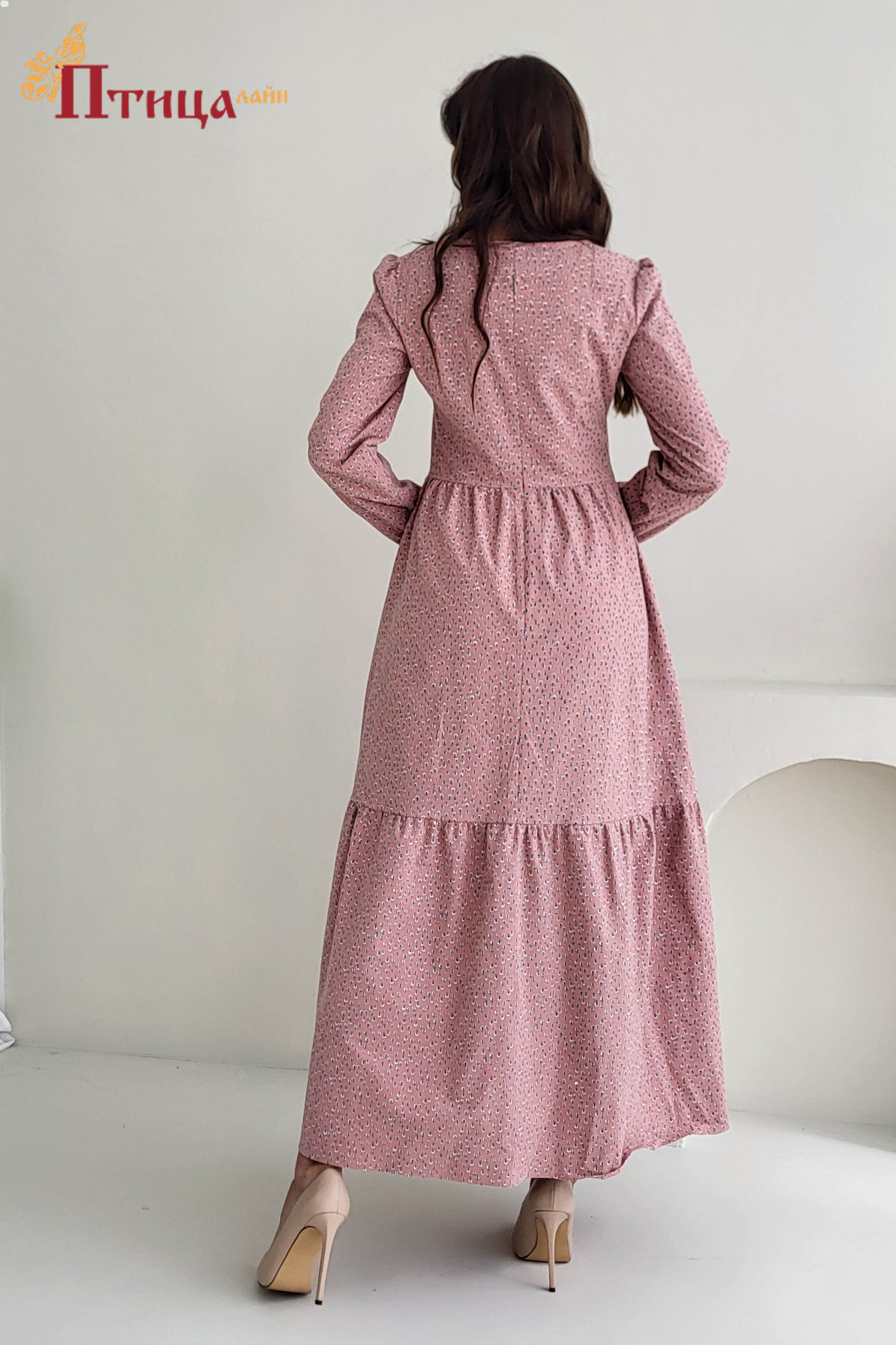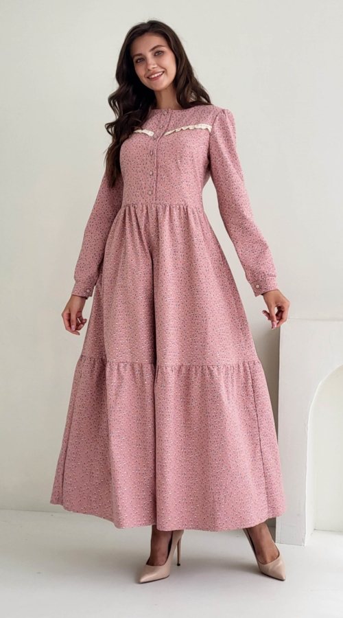 Платье женское отрезное по талии, полуприлегающего силуэта. Юбка расширенная к низу с легкой сборкой по талии, в два яруса на сборку. Рукав втачной, расширенный к низу на широкой манжете. Для удобства по средне...