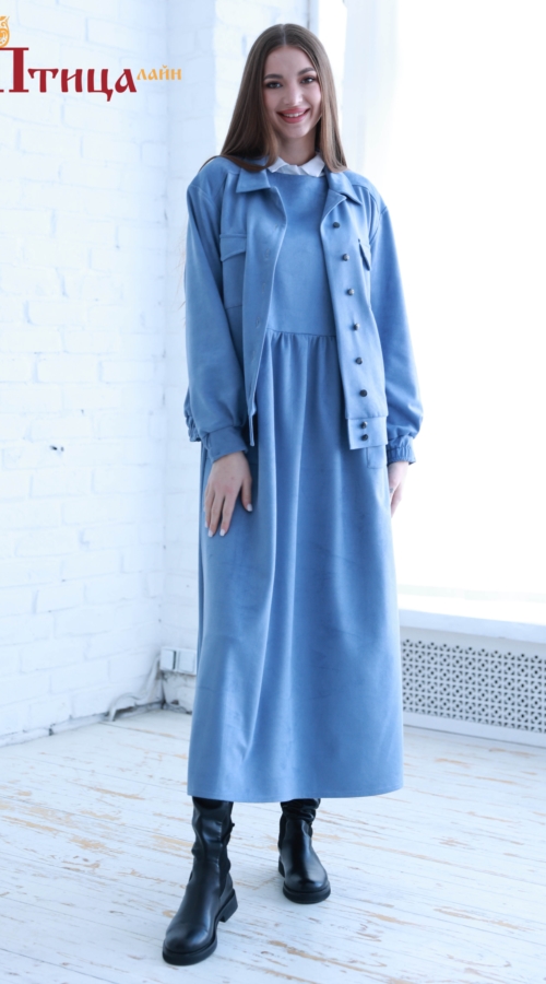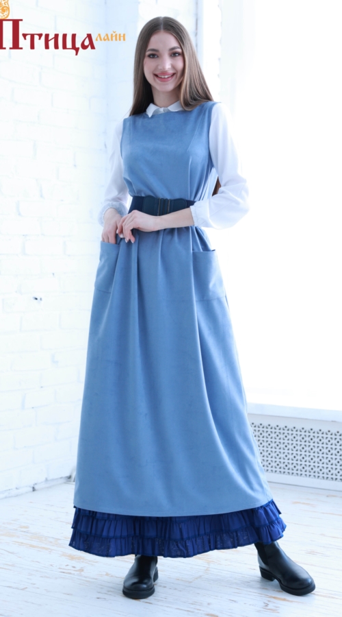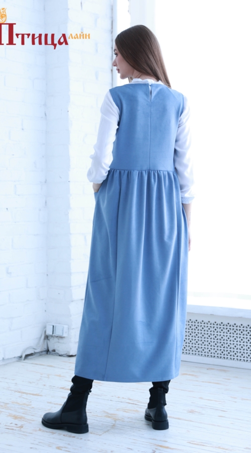 Сарафан с отрезной, завышенной линией талии. Юбка широкая, прямая. Равномерная сборка по линии талии украшает данный лаконичный образ. Идеальную посадку дарит нагрудная выточка, выходящая из плечевого шва. ...
