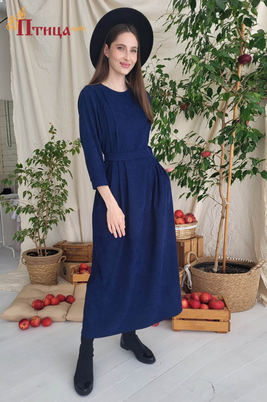 Эффектная модель платья с поясом с чуть завышенной линией талии. Юбка прямая с 6 складками по передней и задней части юбки, юбка имеет хороший шаг. Модель прямого силуэта, застежка по спинке на молнию. Рукав вт...