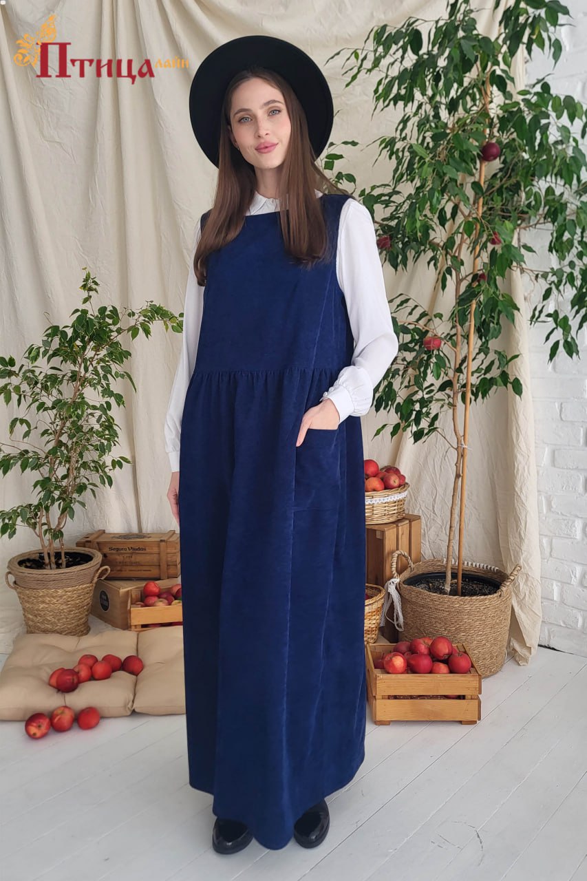 Сарафан с отрезной, завышенной линией талии. Юбка широкая, прямая. Равномерная сборка по линии талии украшает данный лаконичный образ. Идеальную посадку дарит нагрудная выточка, выходящая из плечевого шва....