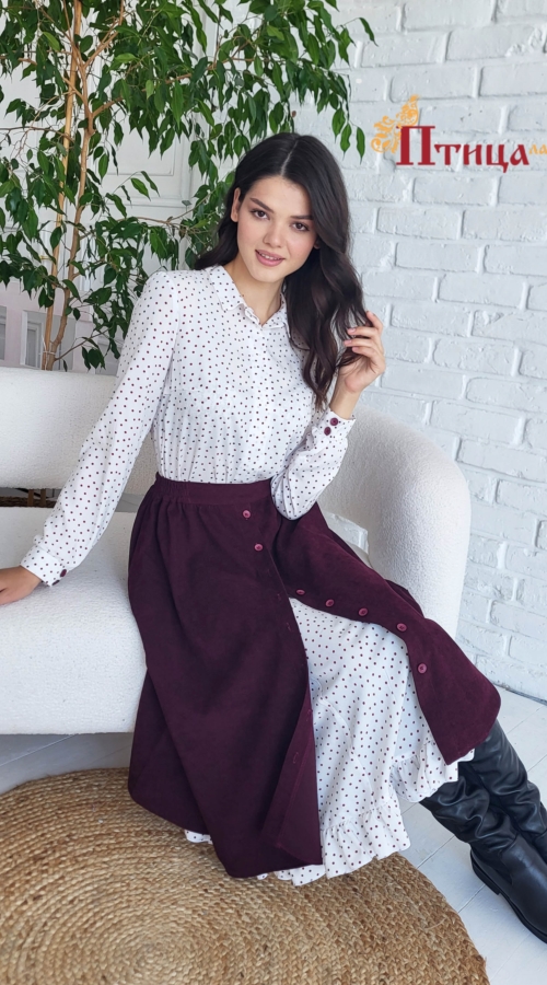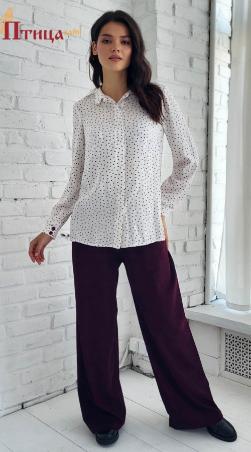 Блуза выполненная из штапеля, трапециевидного силуэта. Рукав втачной прямой, собранный на манжету. По центру полочки супатная застежка на пуговицы. По спинке кокетка, встречная глубокая складка по середине спин...