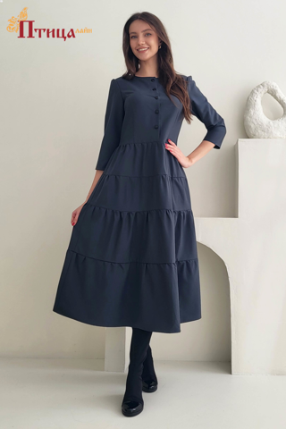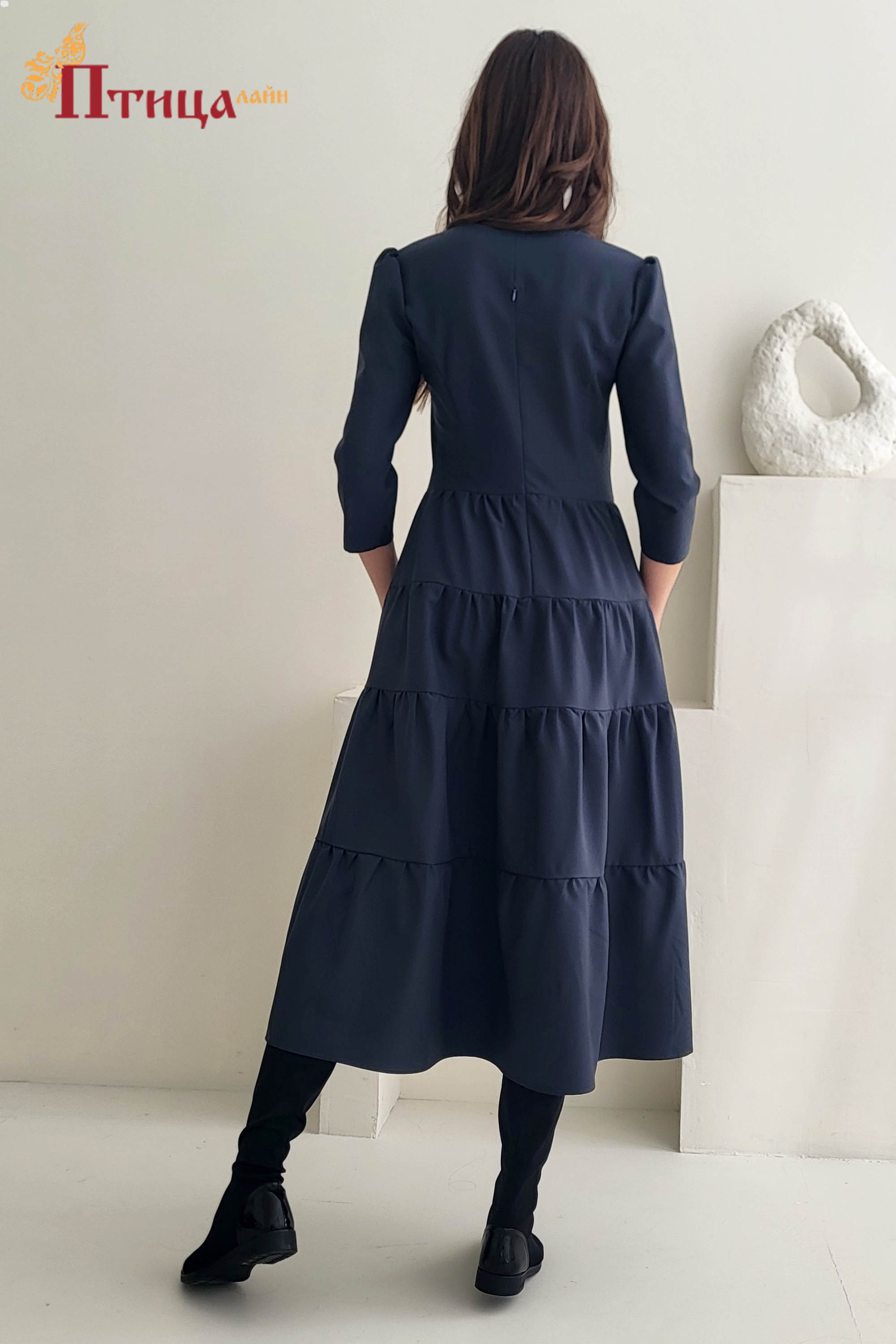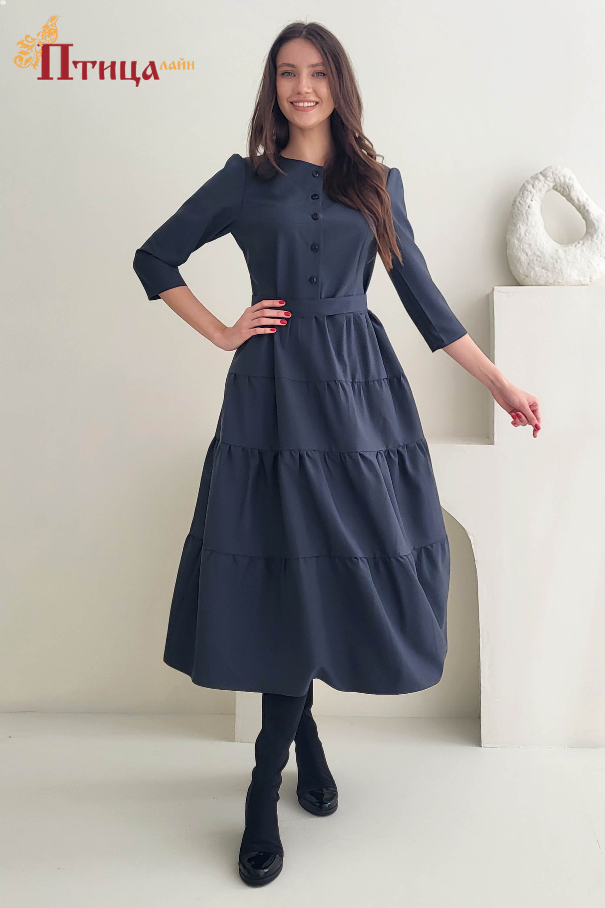 Платье отрезное по линии талии, полуприлегающего силуэта. Юбка расширенная к низу с легкой сборкой по талии, в четыре яруса на сборку. Рукав широкий втачной укороченный, длиной 3/4. Для удобства по среднему ...
