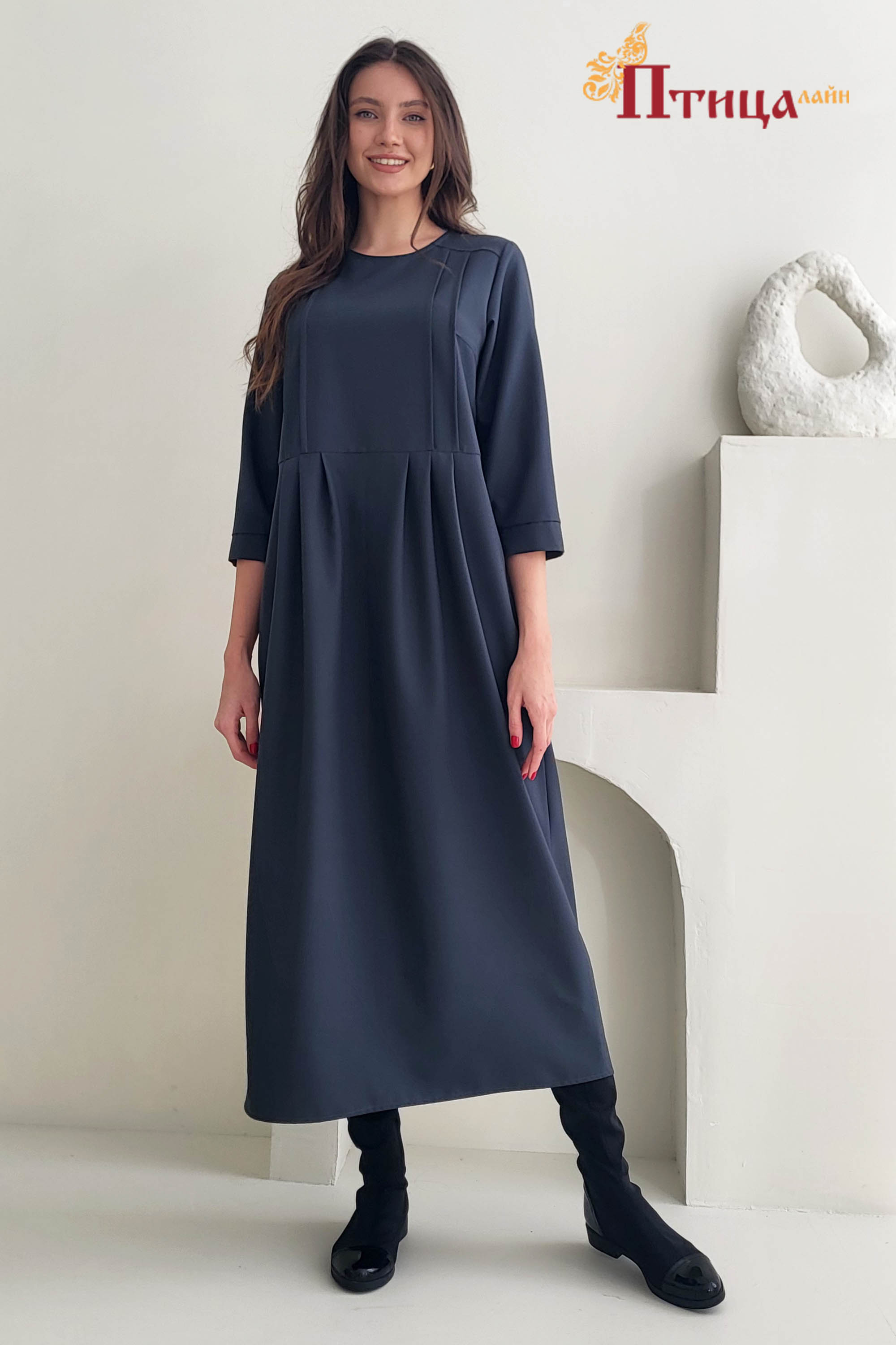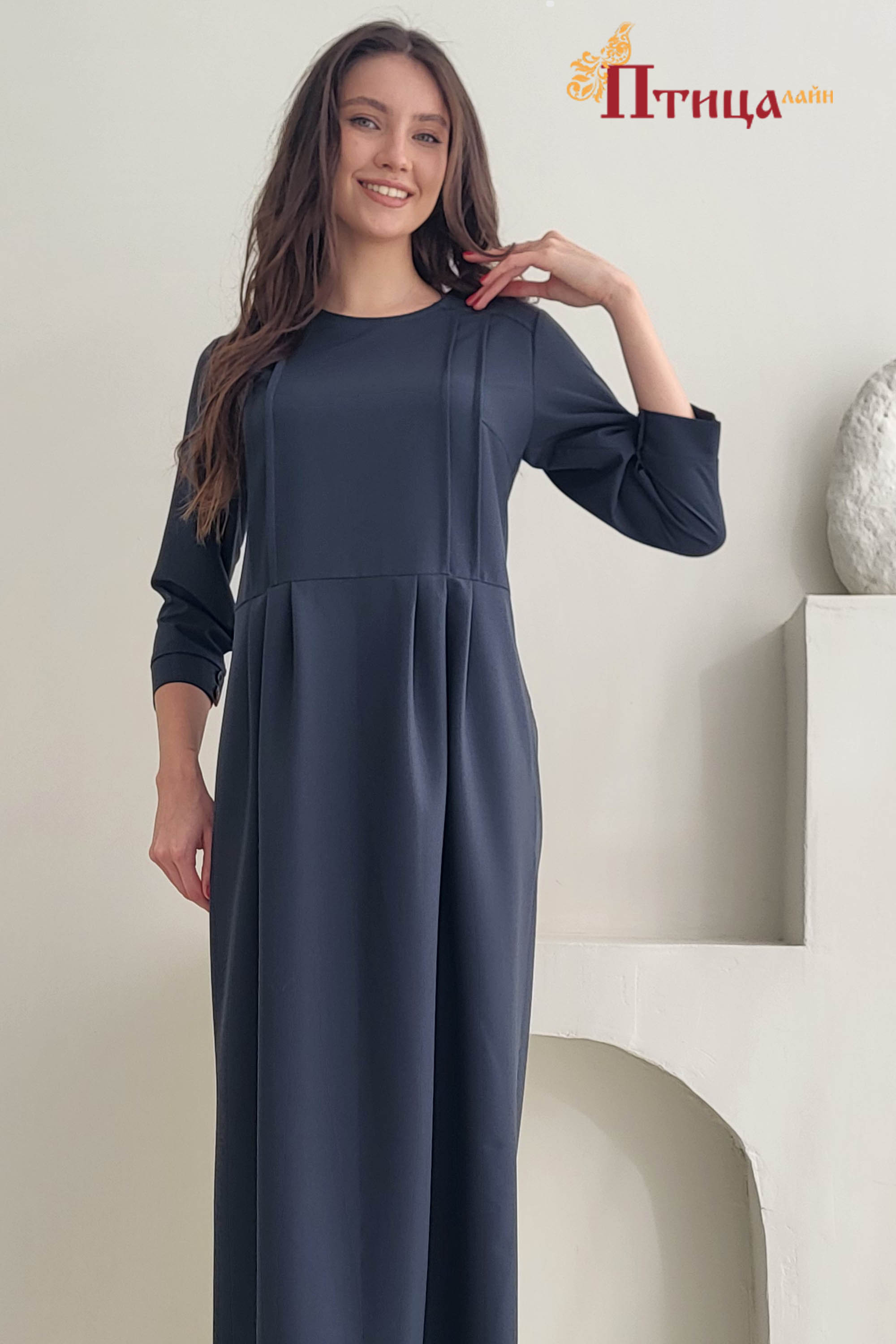 Эффектная модель платья с поясом с чуть завышенной линией талии. Юбка прямая с 6 складками по передней и задней части юбки, юбка имеет хороший шаг. Модель прямого силуэта, застежка по спинке на молнию. Рукав ...