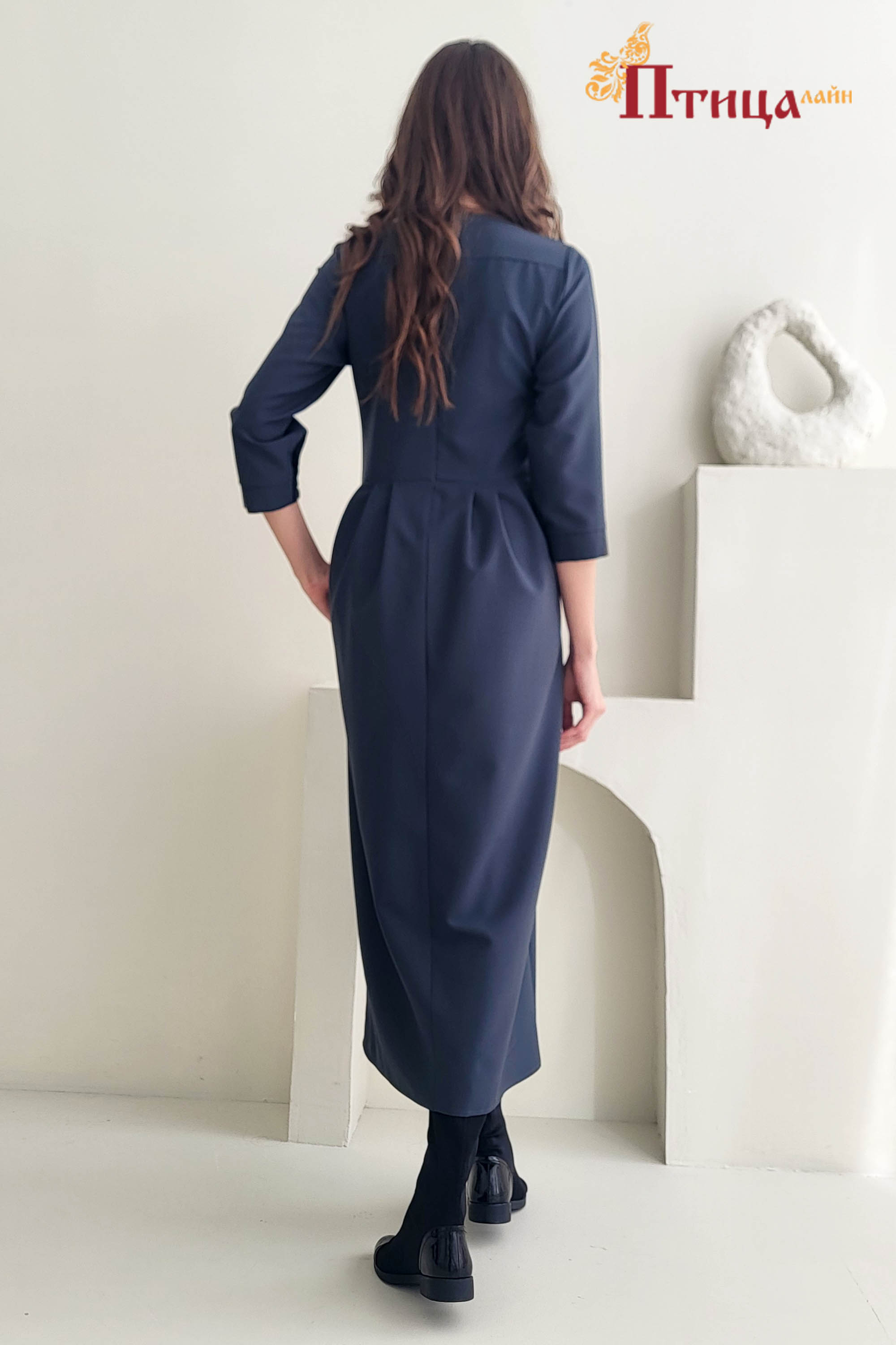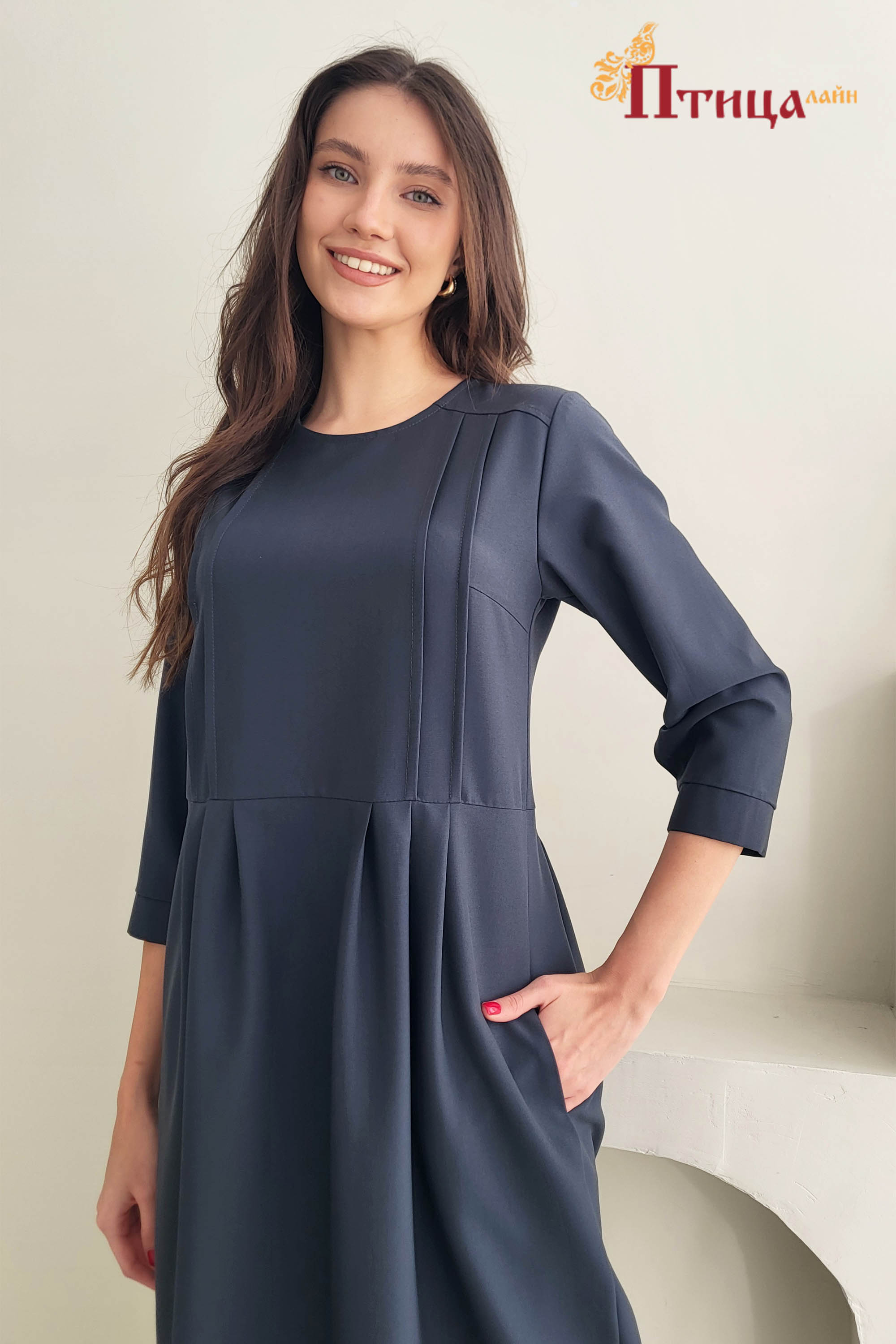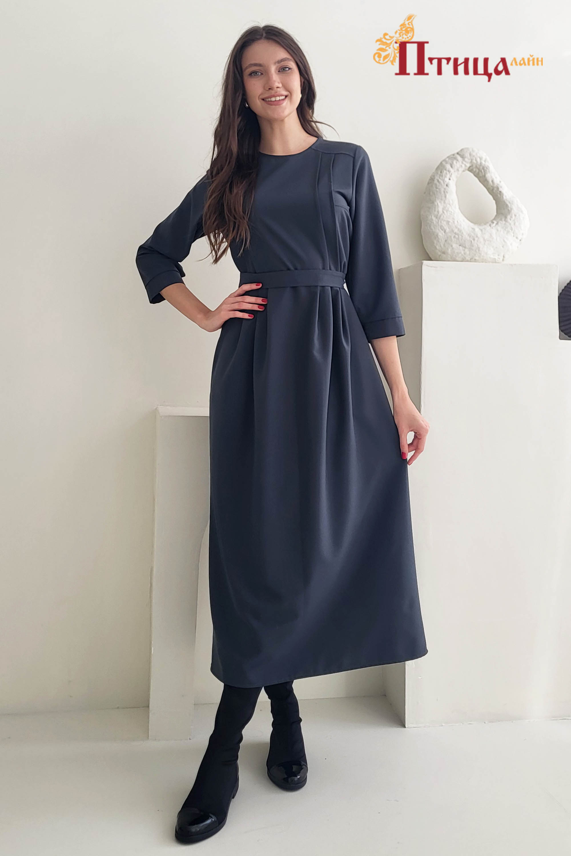 Эффектная модель платья с поясом с чуть завышенной линией талии. Юбка прямая с 6 складками по передней и задней части юбки, юбка имеет хороший шаг. Модель прямого силуэта, застежка по спинке на молнию. Рукав ...