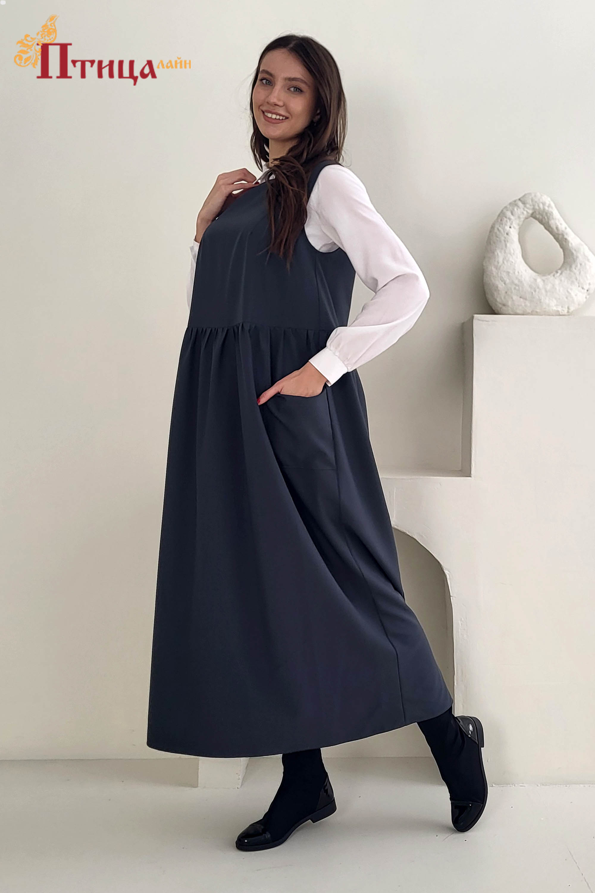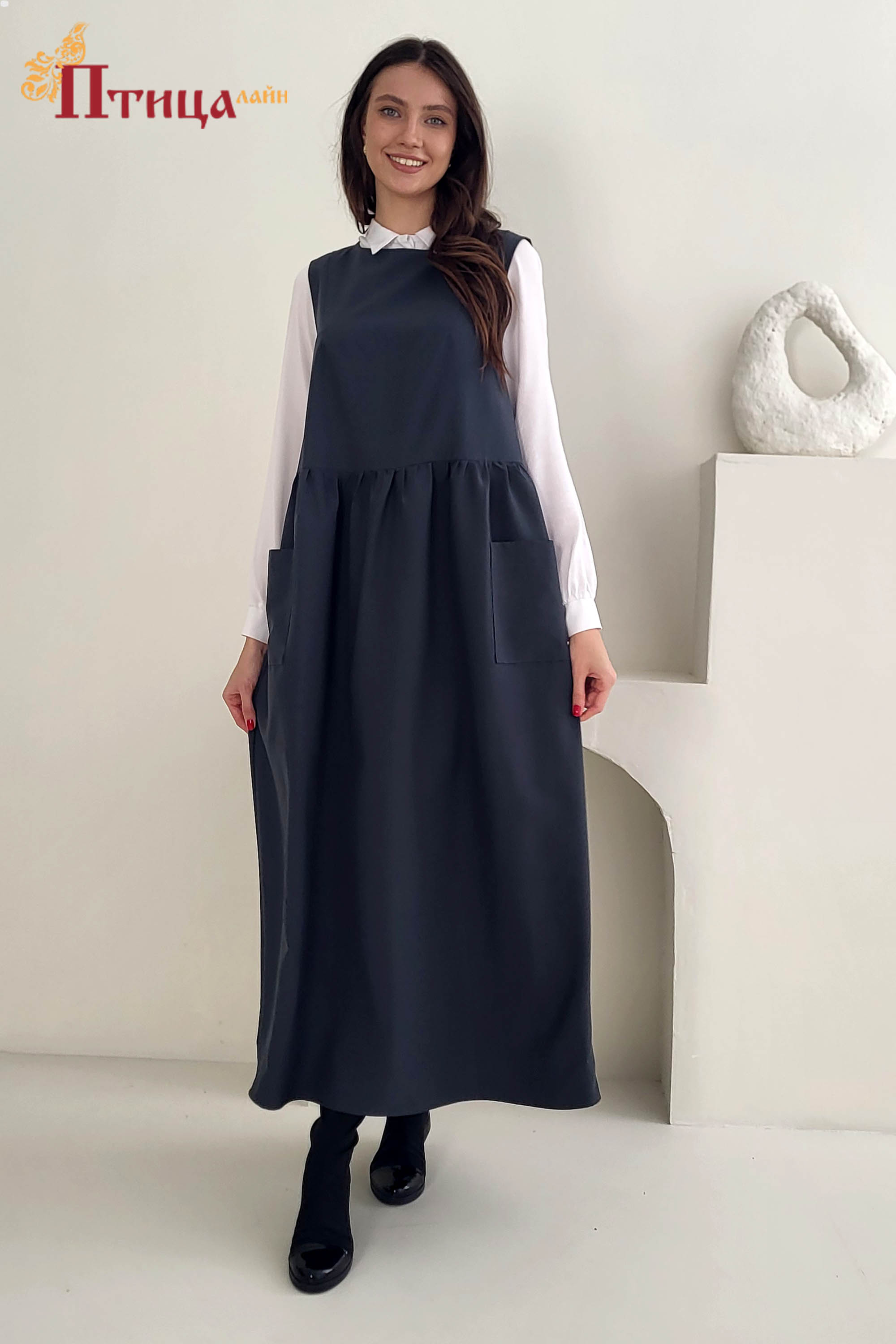 Сарафан с отрезной, завышенной линией талии. Юбка широкая, прямая. Равномерная сборка по линии талии украшает данный лаконичный образ. Идеальную посадку дарит нагрудная выточка, выходящая из плечевого шва. ...
