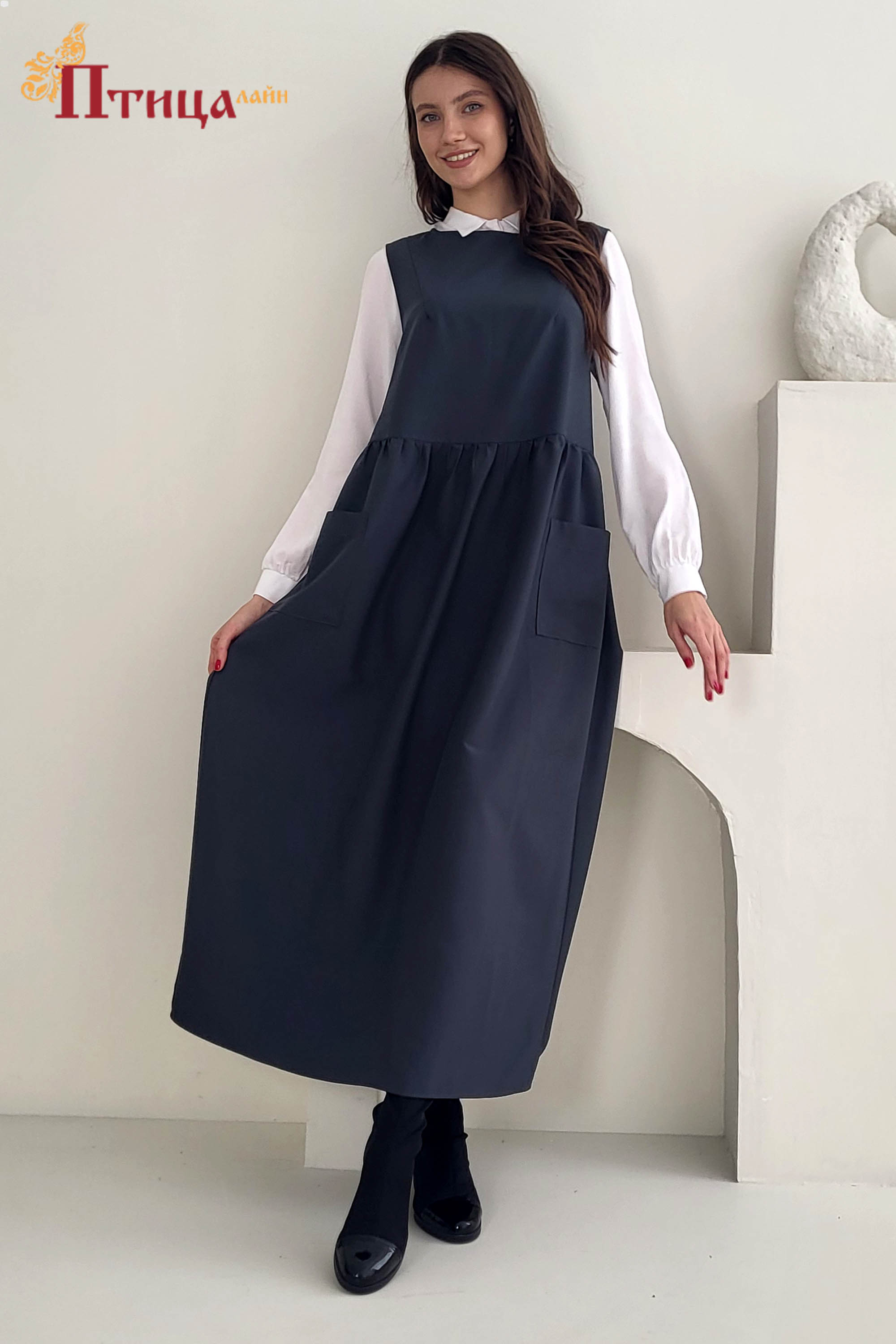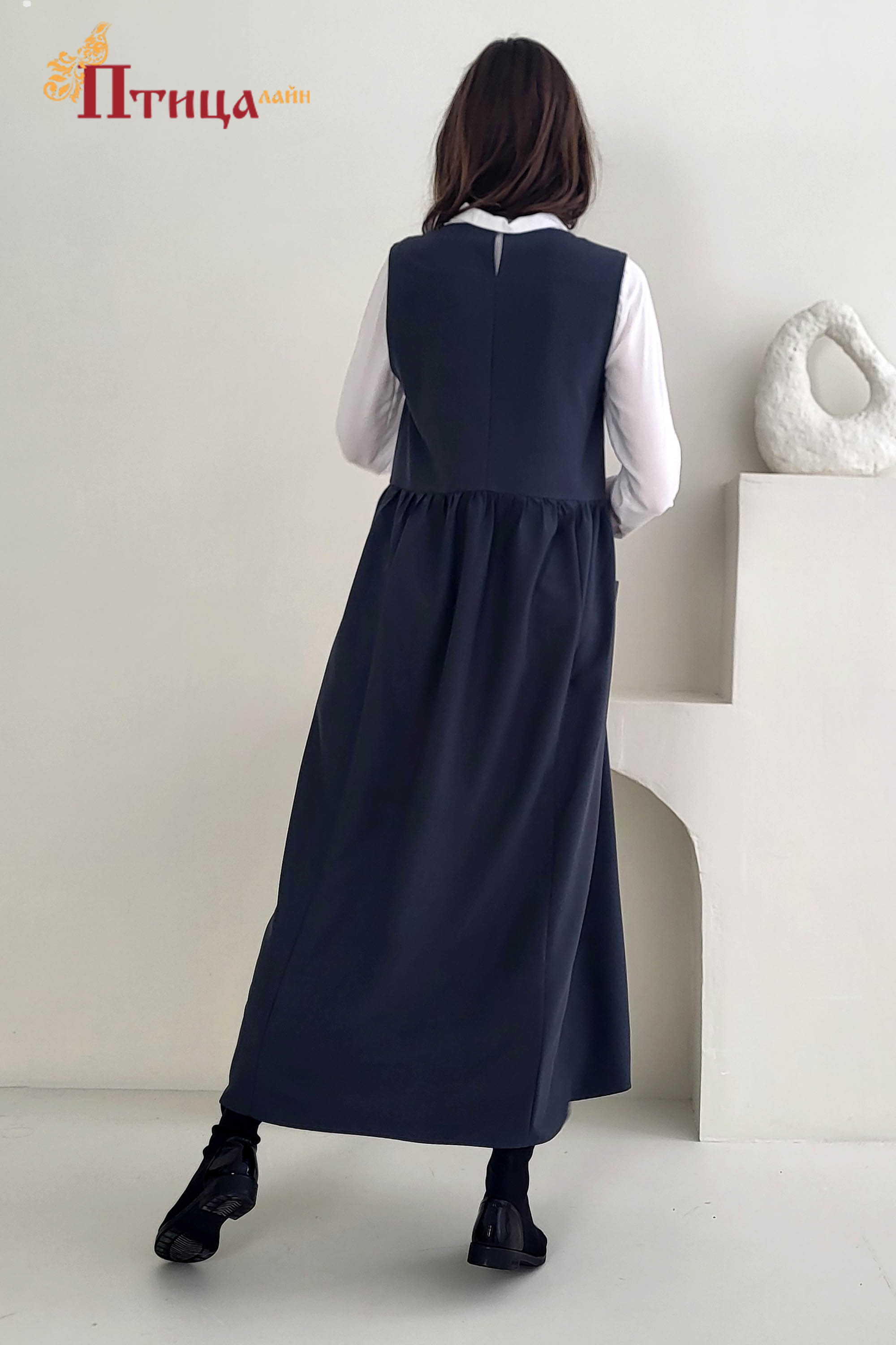Сарафан с отрезной, завышенной линией талии. Юбка широкая, прямая. Равномерная сборка по линии талии украшает данный лаконичный образ. Идеальную посадку дарит нагрудная выточка, выходящая из плечевого шва. ...