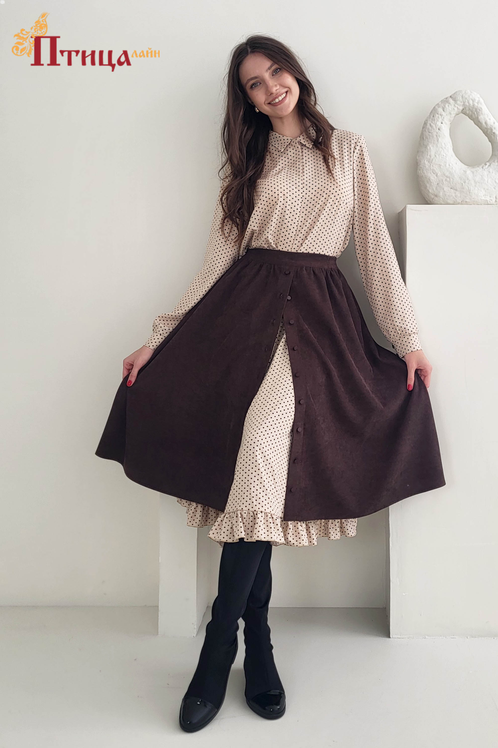 Блуза выполненная из штапеля, трапециевидного силуэта. Рукав втачной прямой, собранный на манжету. По центру полочки супатная застежка на пуговицы. По спинке кокетка, встречная глубокая складка по середине спин...