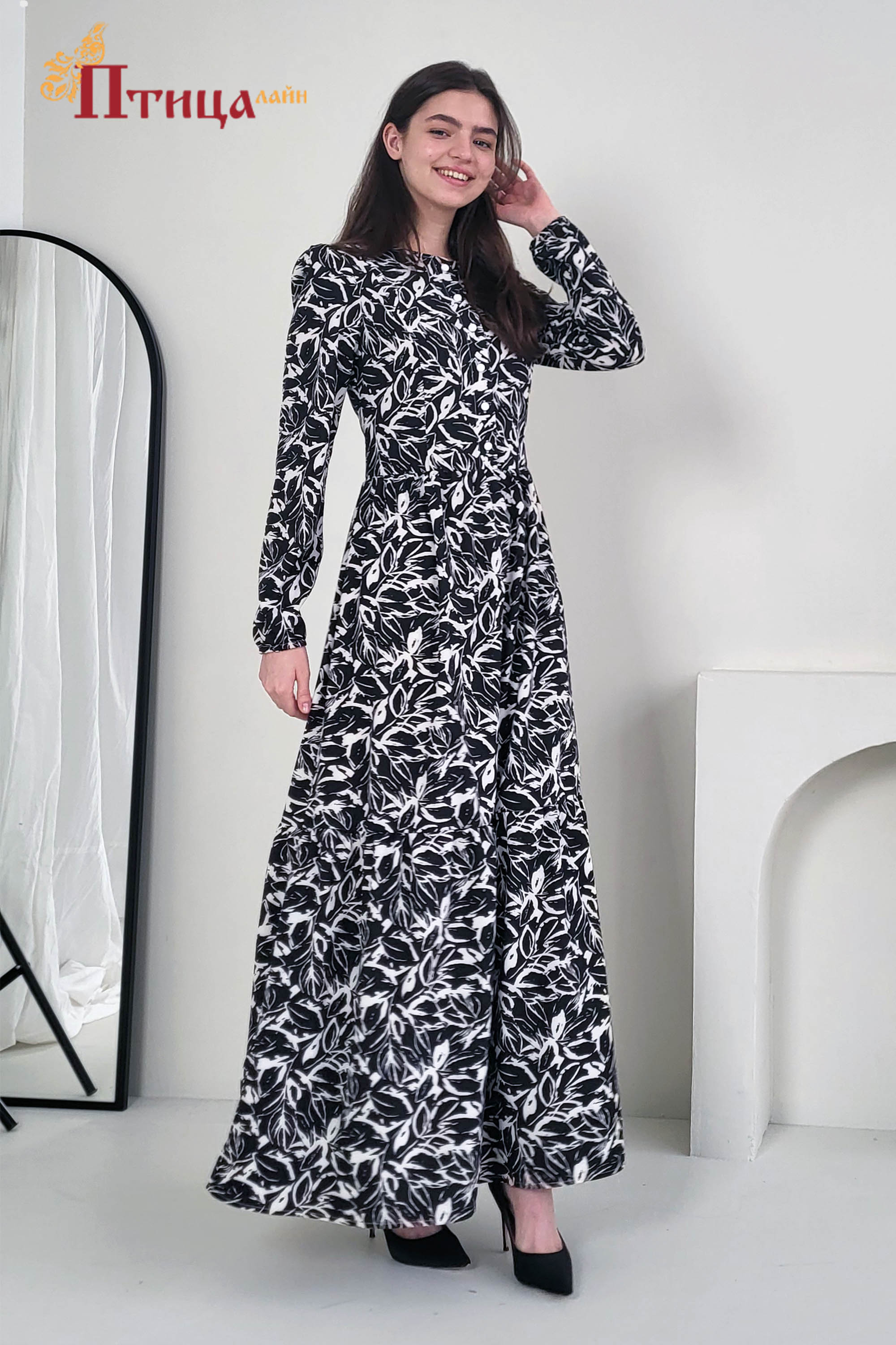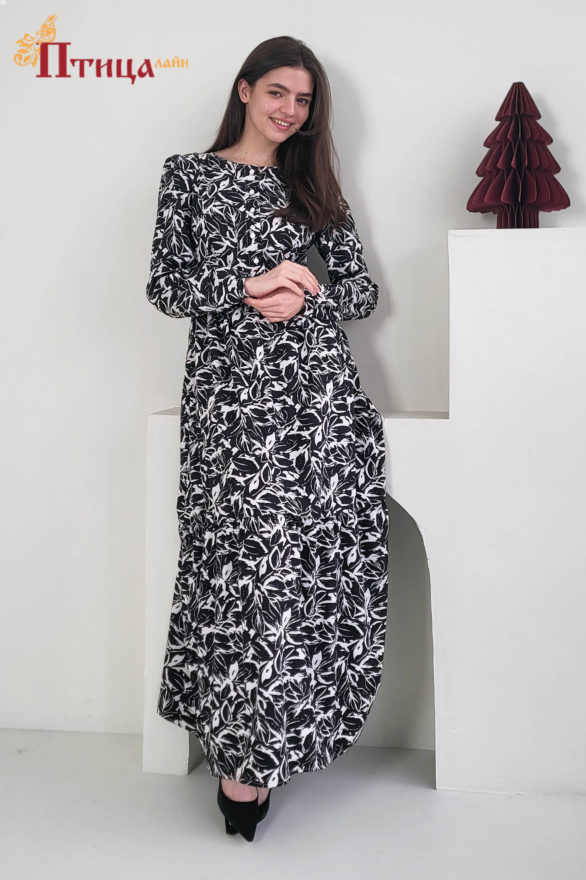 Платье женское отрезное по талии, полуприлегающего силуэта. Прекрасную посадку обеспечивают рельефы выходящие из плечевого шва. Юбка расширенная к низу с легкой сборкой по талии, в два яруса на сборку. Рукав вт...