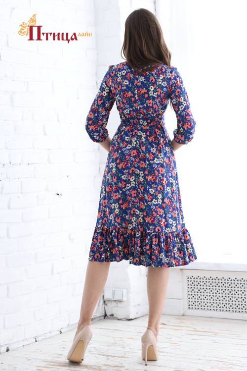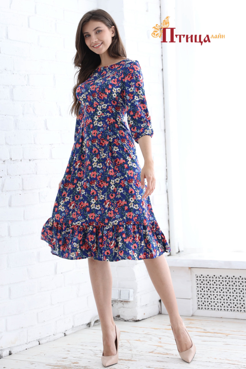 Платье женское отрезное по талии, линия талии завышенная, втачной пояс, по спинке он собран на эластичный спандекс, что улучшает посадку, не стесняя движения. Юбка расклешенная к низу, нижний волан собран на сб...