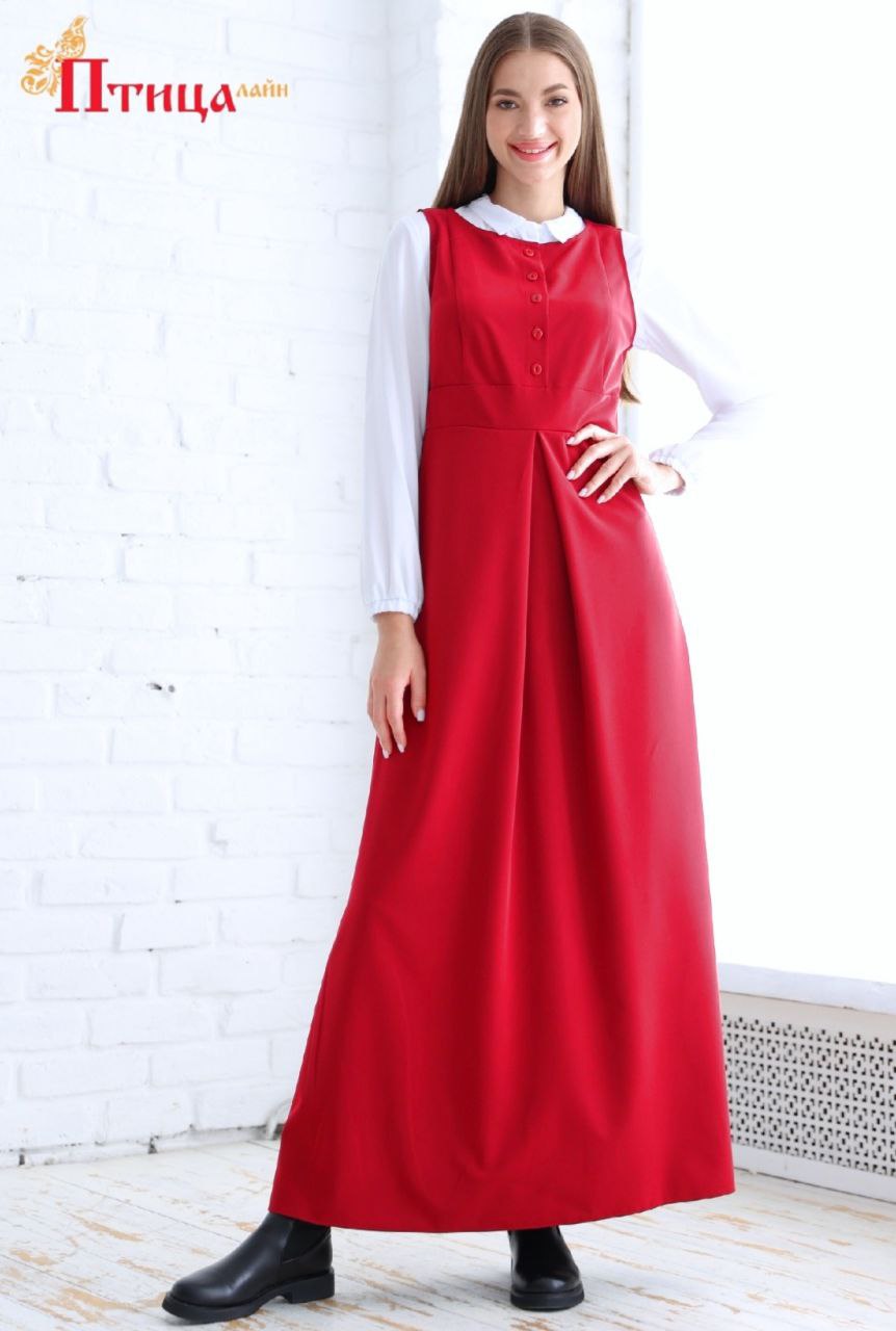 Сарафан «Офисный» отрезной по талии, линия талии завышенная. Юбка расклешенная к низу, по полочке встречная складка. Рельефы на полочке и спинке. Для удобства по среднему шву на спинке застежка на «молнию». По ...