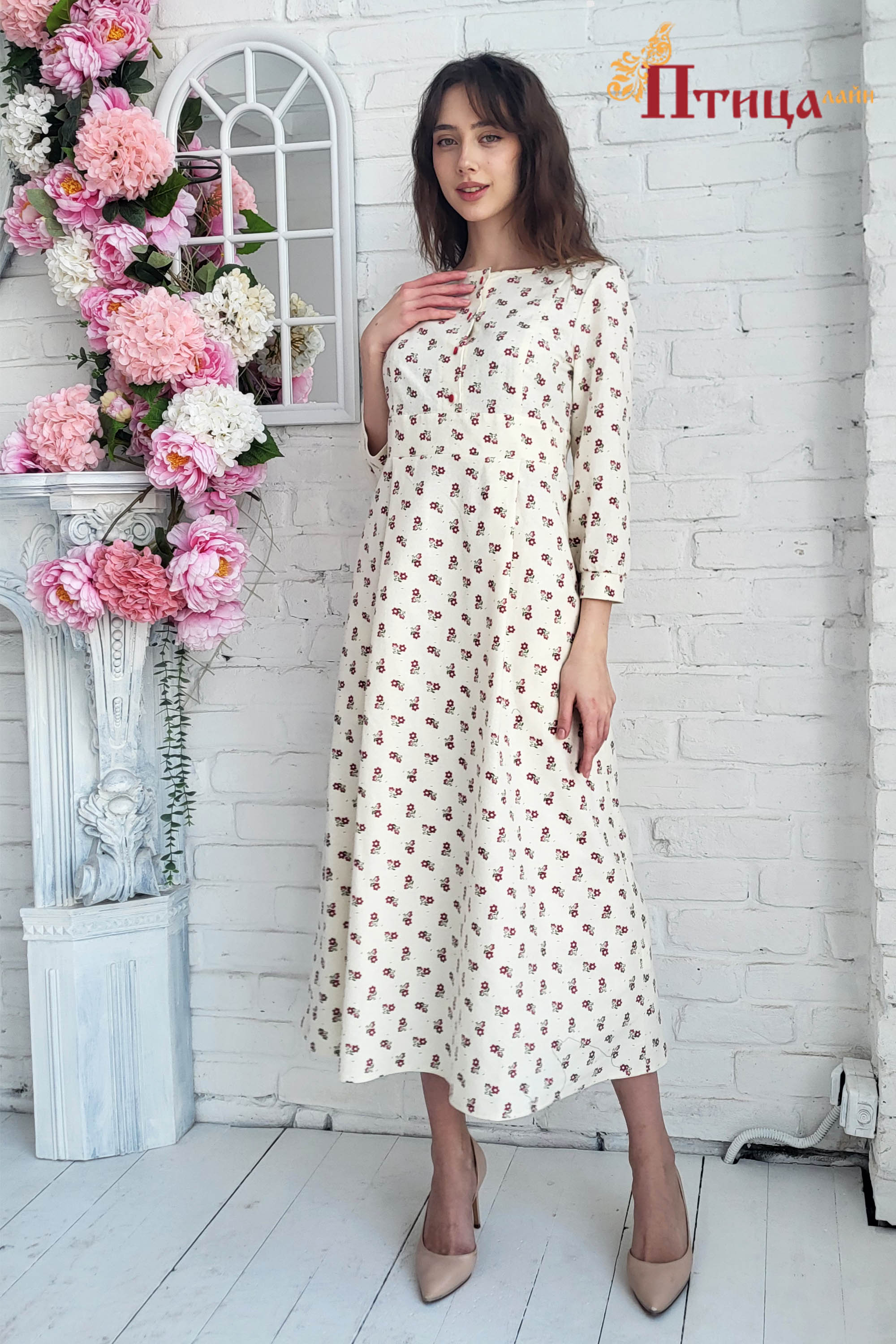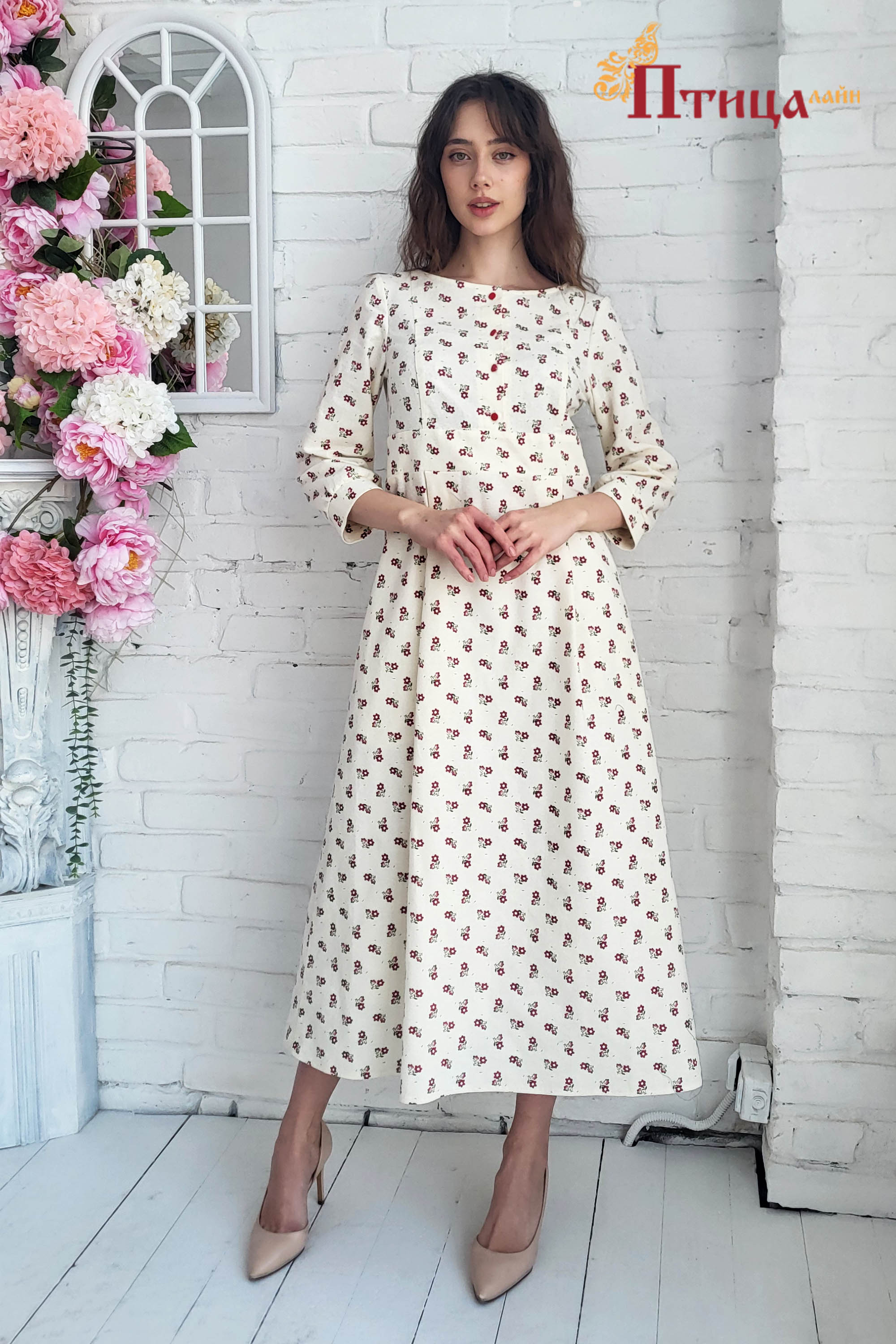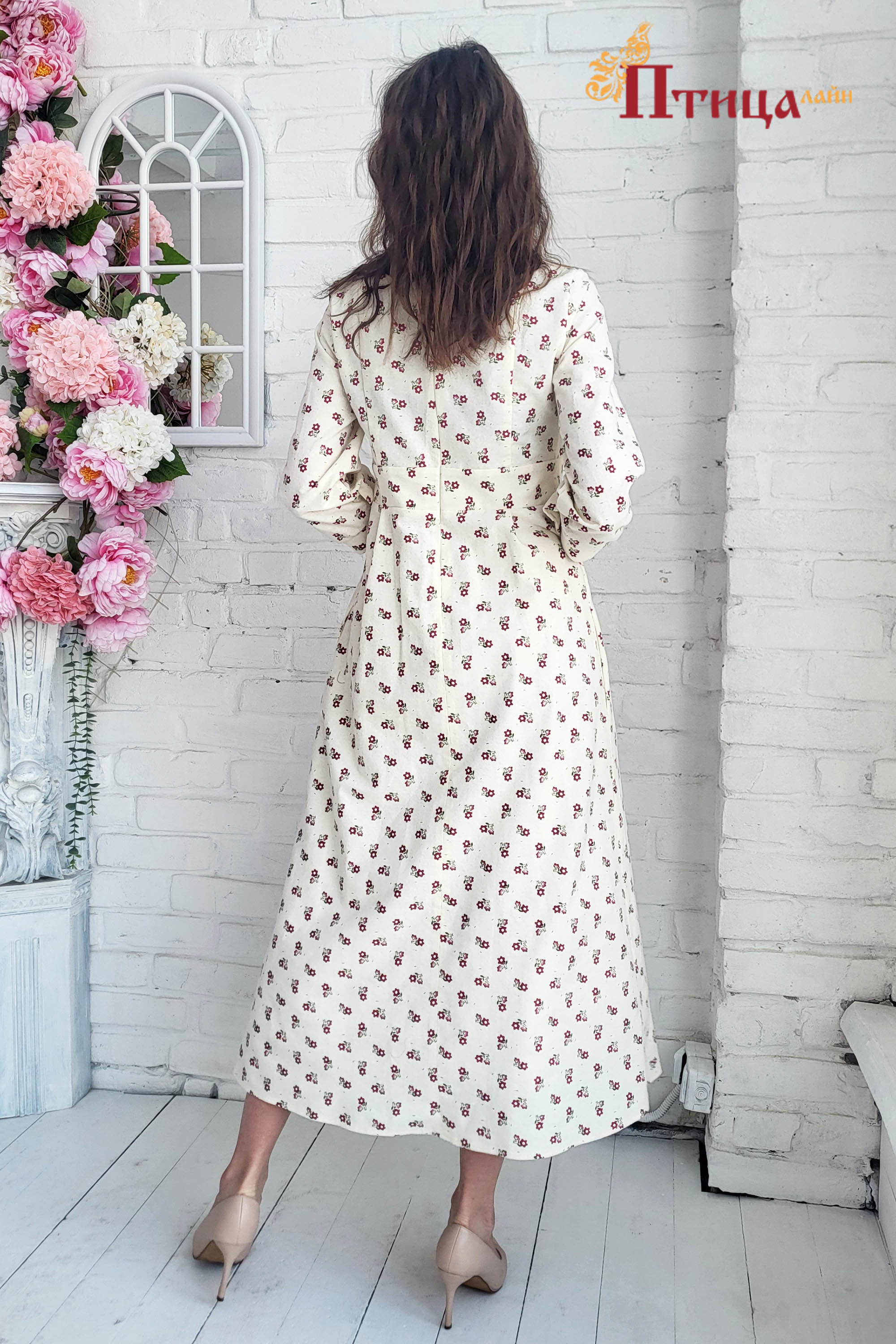 Платье женское отрезное с втачным поясом, линия талии завышенная. Юбка расклешенная к низу, с двумя складками. Рукав втачной, широкий, длиной 3/4, низ рукава собран на манжету с пуговкой. Рельефы на полочке и с...