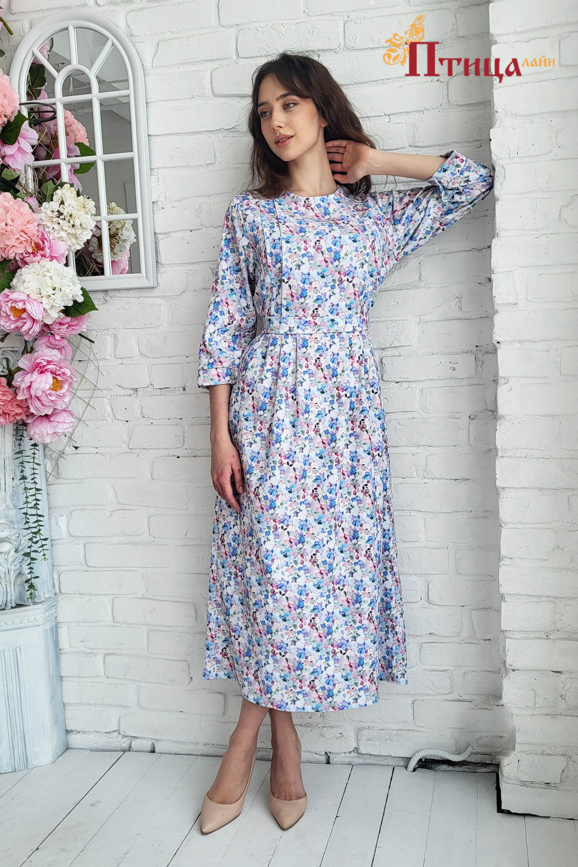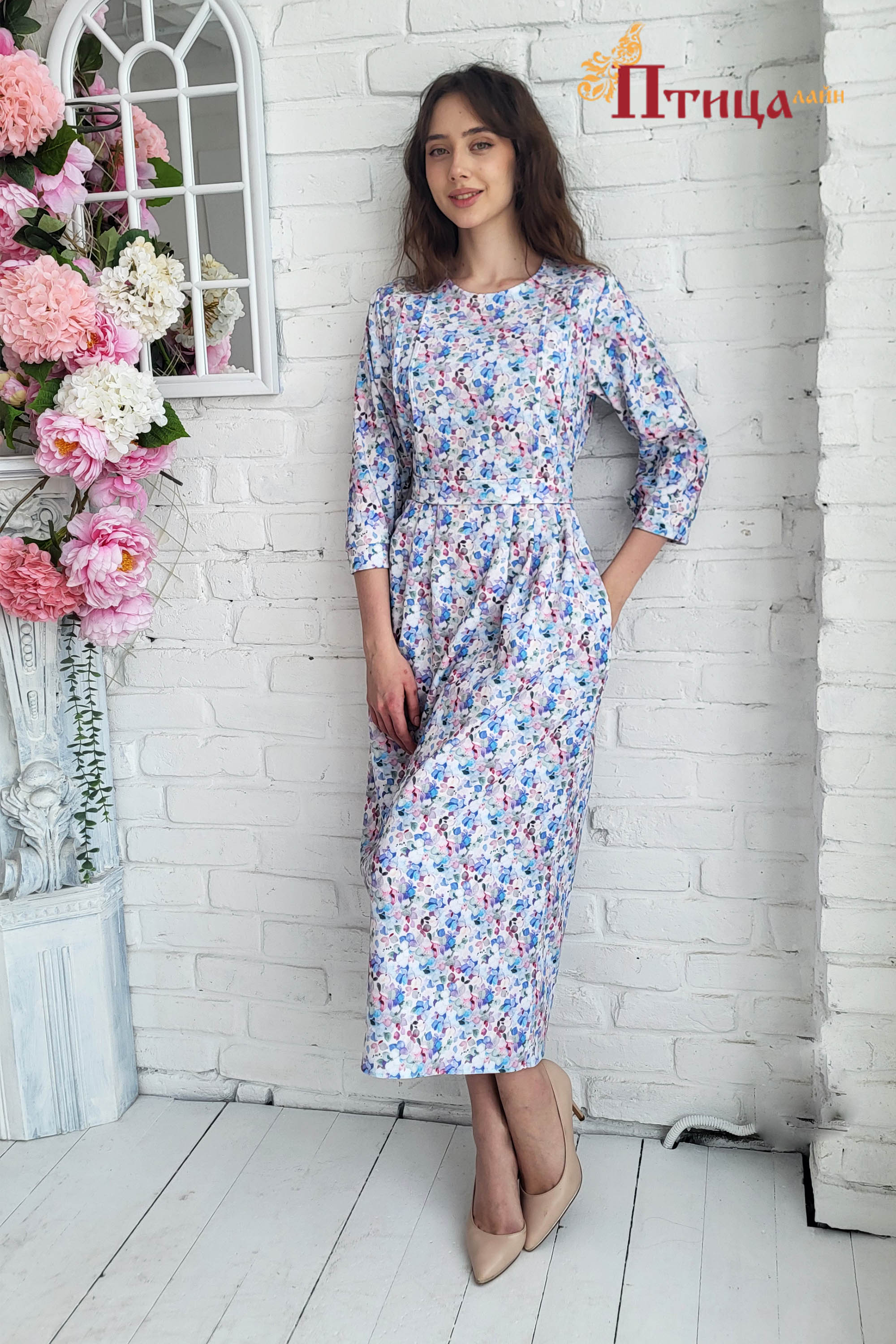 Эффектная модель платья с поясом с чуть завышенной линией талии. Юбка прямая с 6 складками по передней и задней части юбки, юбка имеет хороший шаг. Модель прямого силуэта, застежка по спинке на молнию. Рукав вт...