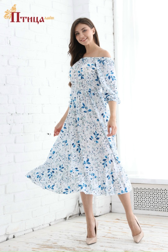 Необыкновенной красоты, платье с открытой линией плеча. Данный образ напоминает о море, солнце, летних теплых деньках, вечерних прогулках. Платье отрезное по талии, сборка на эластичную ленту по линии горловин...