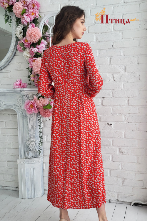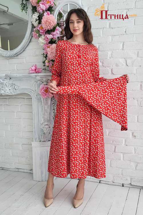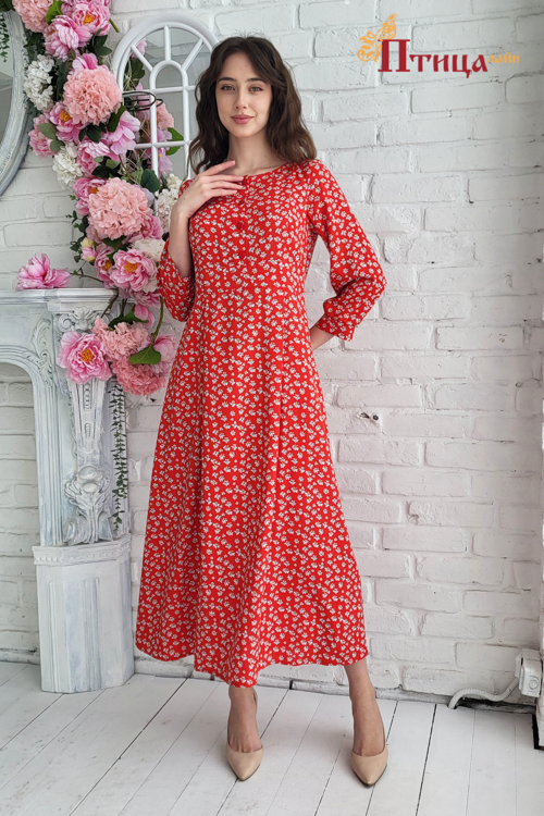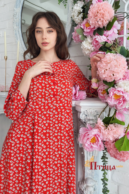 Платье женское отрезное с втачным поясом, линия талии завышенная. Юбка расклешенная к низу с карманами в боковом шве. Рукав втачной, широкий, длиной 3/4, низ рукава собран на мандету с пуговкой. Рельефы на пол...