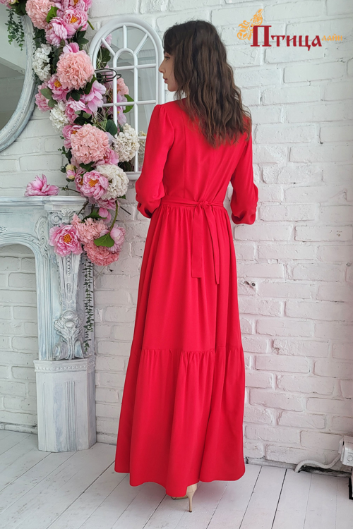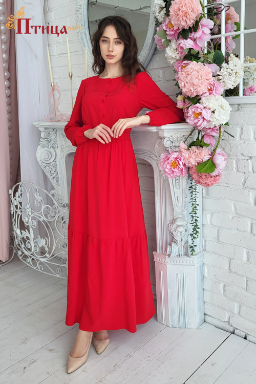 Платье женское отрезное по талии, полуприлегающего силуэта. Прекрасную посадку обеспечивают рельефы выходящие из плечевого шва. Юбка расширенная к низу с легкой сборкой по талии, в два яруса на сборку. Рукав вт...