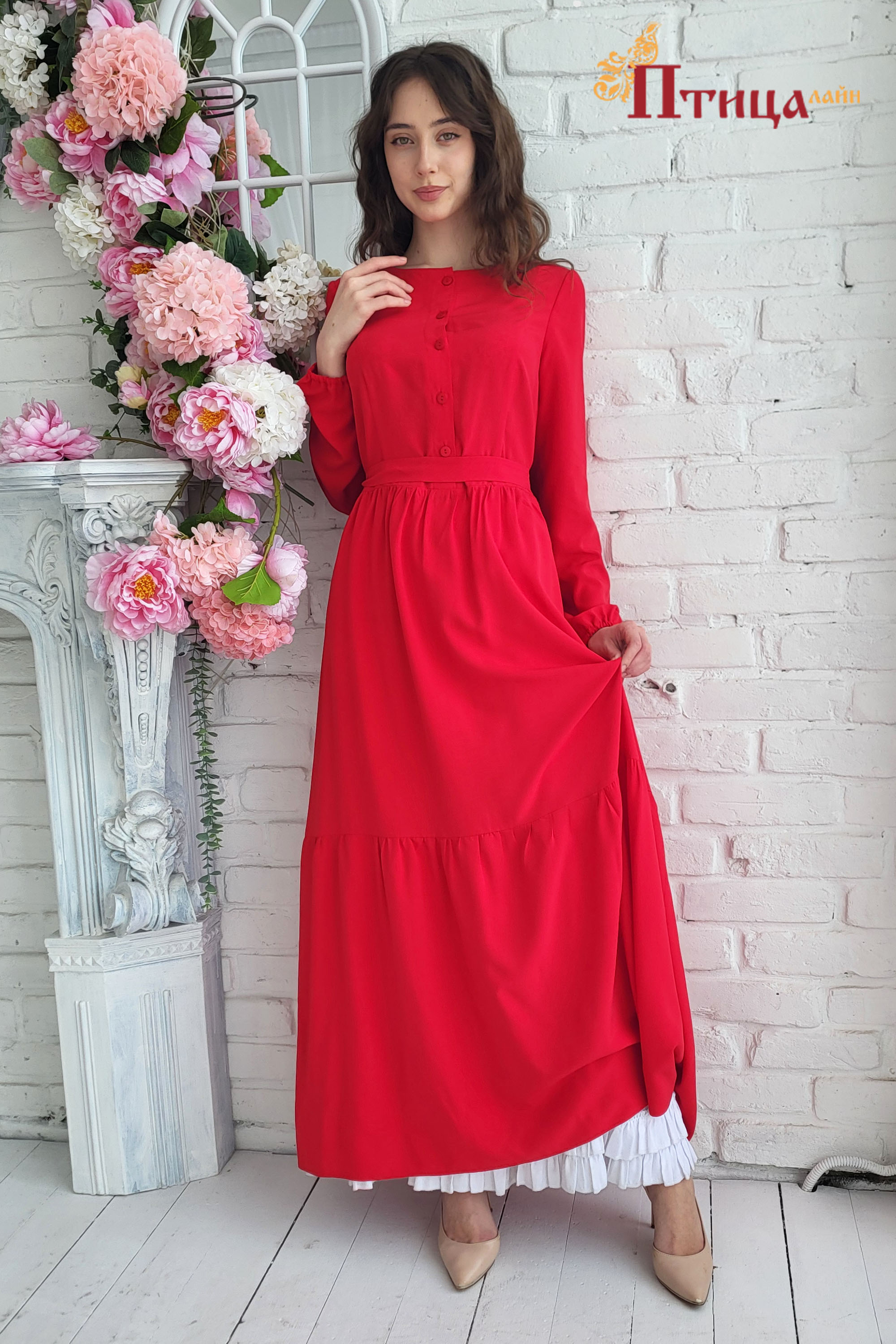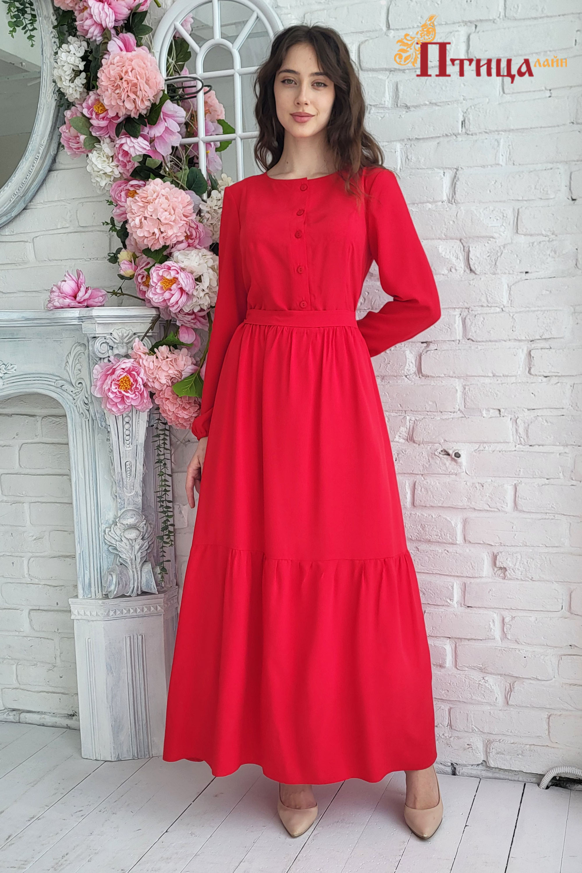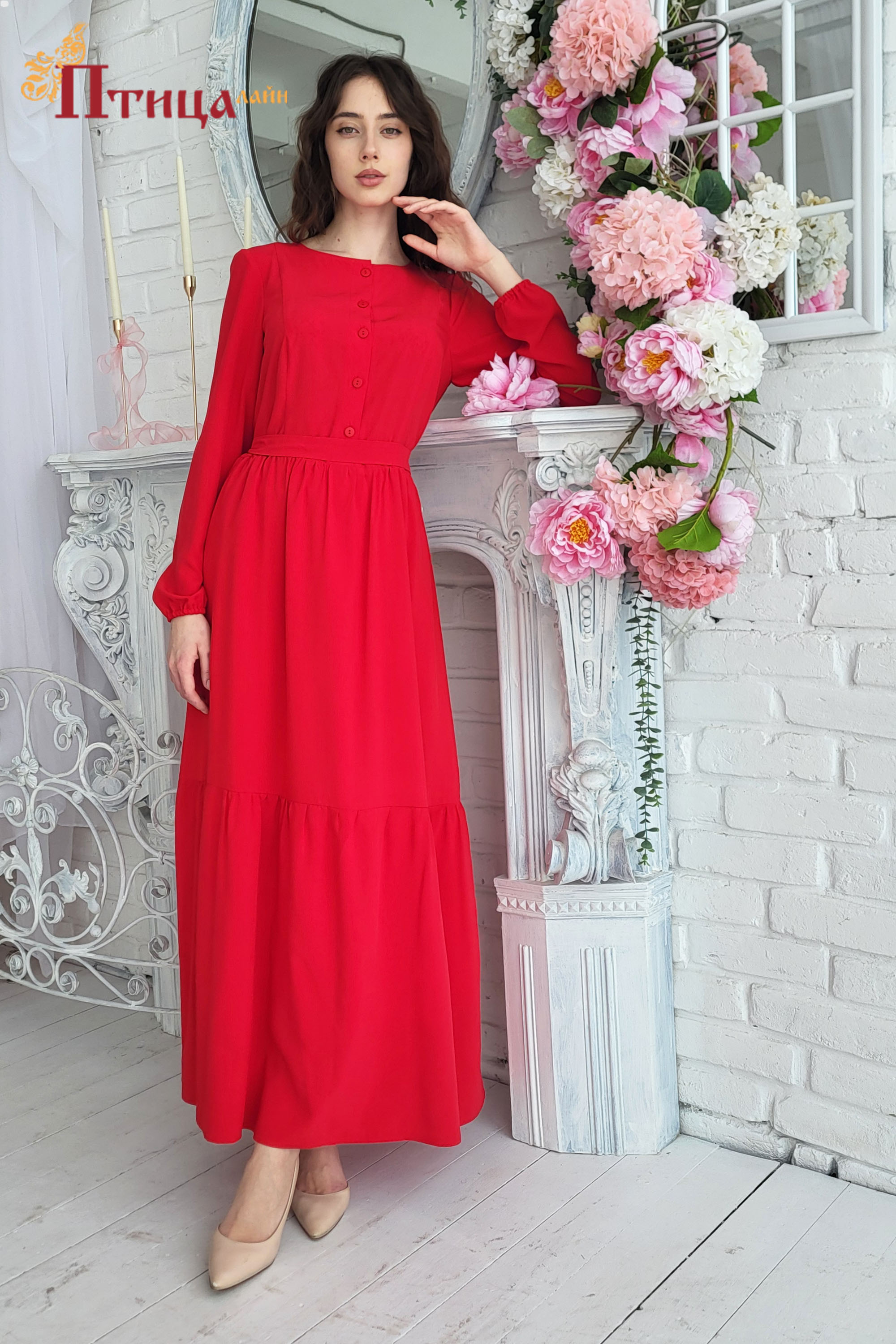 Платье женское отрезное по талии, полуприлегающего силуэта. Прекрасную посадку обеспечивают рельефы выходящие из плечевого шва. Юбка расширенная к низу с легкой сборкой по талии, в два яруса на сборку. Рукав вт...