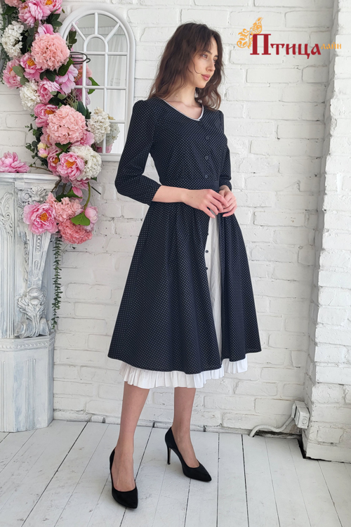 Платье "Элегия" - прекрасное сочетание строгости и романтичности. Силуэт полуприлегающий, достигается за счет рельефов на полочке и спинке. Линия талии завышенная, тонкий поясок легко корректирует приталенность модели, подчеркивает женственный силуэт, горловина аккуратная лодочка. Юбка полусолнце с боковыми швами, при движении образуется красивая волна по подолу. Рукав втачной зауженный, длиной 3/4, не сковывает движения руки. Застежка на «молнию» по спинке.