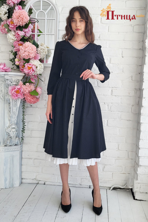 Платье отрезное по талии, полуприлегающего силуэта. Юбка расширенная к низу с легкой сборкой по талии. Линия горловины V-образный вырез с центральной застежкой, украшенный хлопковым кружевом. Рукав втачной длиной 3/4 , расширенный к низу на манжете. Рельефы по полочке и по спинке обеспечивают хорошую посадку изделию в любом размере.