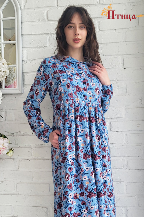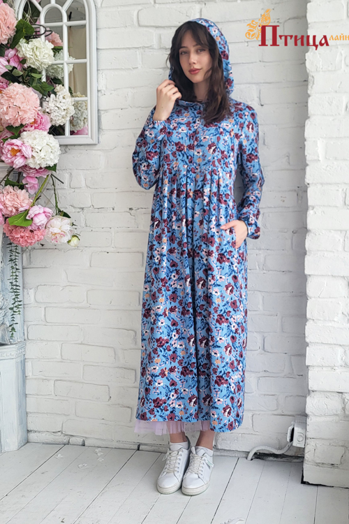 Платье женское с капюшоном отрезное по талии, линия талии завышенная. Юбка широкая с со складками по центу изделия, по передней и задней части юбки, что создает дополнительную свободу в области талии и бедер. Р...